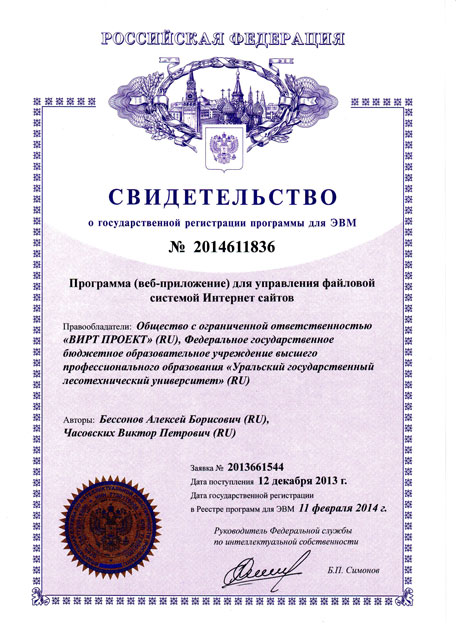 40 | Свидетельство о государственной регистрации программы для ЭВМ | Программа (веб-приложение) для управлении файловой системой Интернет сайтов | Часовских | 2014611836 | 11 февраля 2014 г. | Общество с ограниченной ответственностью «ВИРТ ПРОЕКТ» (RU), Федеральное государственное бюджетное обраюватсльное учреждение высшего профессионального обраювания «Уральский государственный лесотехнический университет» (RU) | Бессонов Алексей Борисович (RU). Часовских Виктор Петрович (RU) | 2013661544 | 12 декабря 2013 г. | Посмотреть |