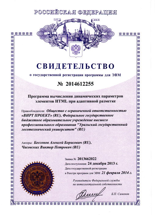 51 | Свидетельство о государственной регистрации программы для ЭВМ | Программа вычисления динамических параметров элементов HTML при алаптивной разметке | Часовских | 2014612255 | 21 февраля 2014 г. | Общество с ограниченной ответственностью «ВИРТ ПРОЕКТ» (RU), Федеральное государственное бюджетное образовательное учреждение высшего профессионазьного образования "Уральский государственный лесотехнический университет " (RU) | Бессонов Алексей Борисович (RU), | 2013662022 | 24 декабря 2013 г. | Посмотреть |