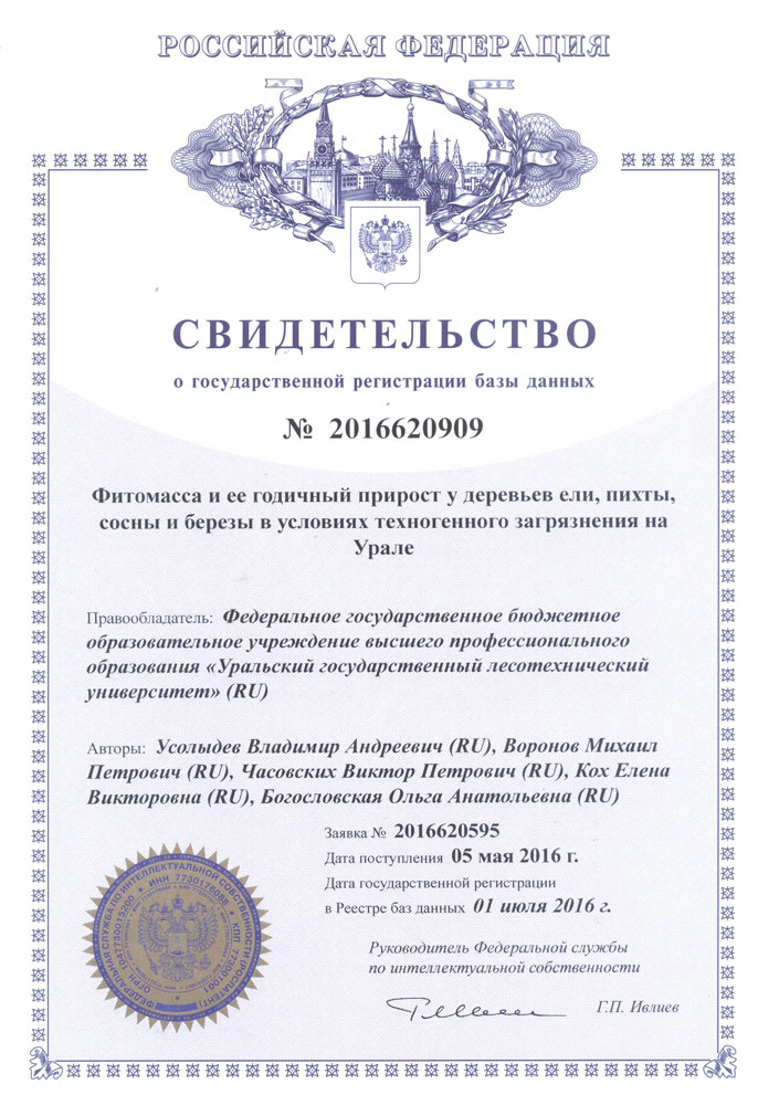 80 | СВИДЕТЕЛЬСТВО о государственной регистрации базы данных | Фитомасса и ее годичный прирост у деревьев ели, пихты, сосны и березы в условиях техногенного загрязнения на Урале | Часовских | 2016620909 | 01 ИЮЛЯ 2016 г. | Федеральное государственное бюджетное образовательное учреждение высшего профессионального образования «Уральский государственный лесотехнический университет» (RU) | Усольцев Владимир Андреевич (RU), Воронов Михаил Петрович (RU), Часовских Виктор Петрович (RU), Кох Елена Викторовна (RU), Богословская Ольга Анатольевна (RV) | 2016620595 | Дата поступления 05 мая 2016 г. Дата государственной регистрации в Реестре баз данных 01 ИЮЛЯ 2016 г. | Посмотреть |