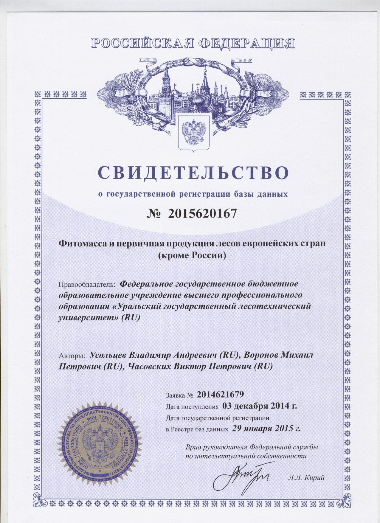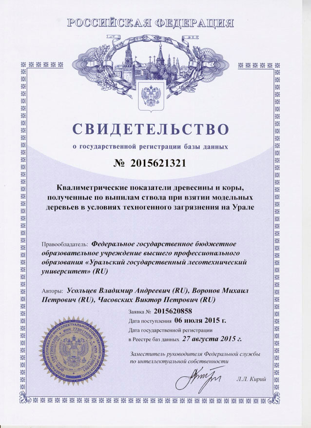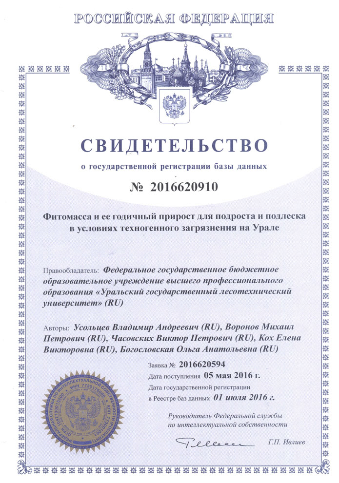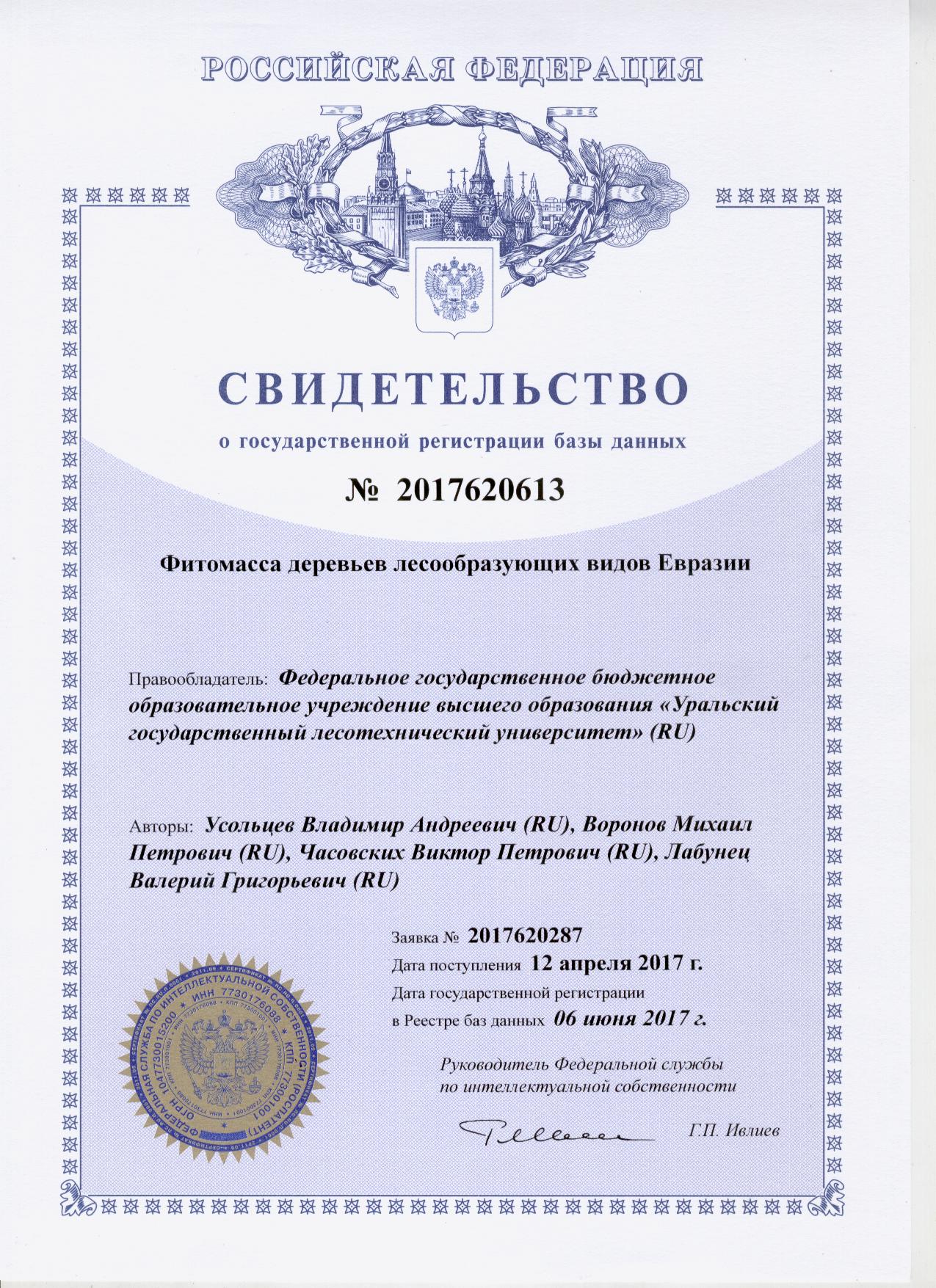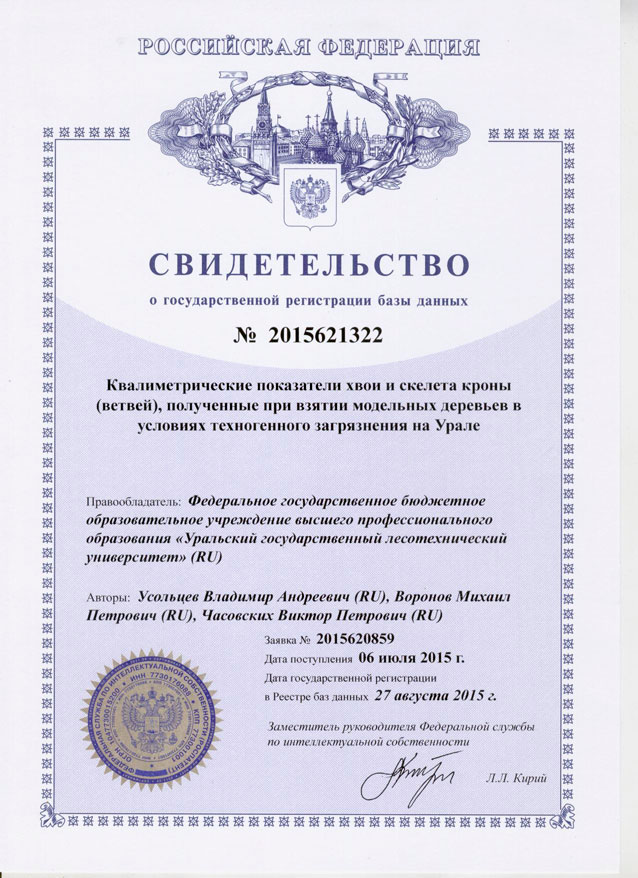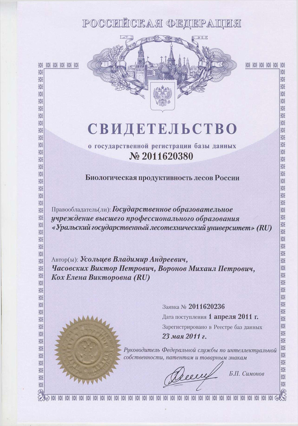 17 | Свидетельство о государственной регистрации базы данных | Биологическая продуктивность лесов России | Часовских | 2011620380 | 23 мая 2011 г. | Государственное образовательное учреждение высшего профессионального образования « Уральский государственный лесотехнический университет» (RU) | Усольцев Владимир Андреевич,Часовских Виктор Петрович, Воронов Михаил Петрович, Кох Елена Викторовна (RU) | 2011620236 | 1 апреля 2011 г. | Посмотреть |