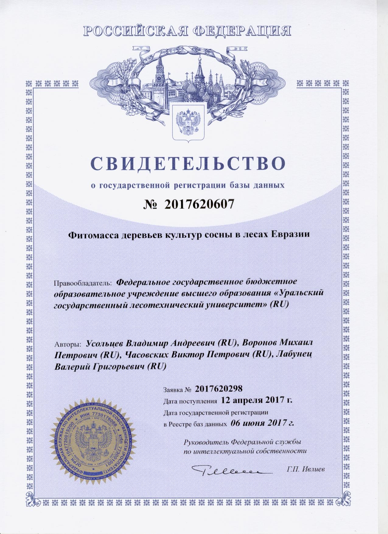 76 | Свидетельство о государственной регистрации базы данных | Фитомасса деревьев культур сосны в лесах Евразии | Часовских | 2017620607 | 06 июня 2017 г. | Федеральное государственное бюджетное образовательное учреждение высшего образования «Уральский государственный лесотехнический университет» | Усольцев В.А., Воронов М.П., Часовских В.П., Лабунец В.Г. | 2017620298 | Посмотреть | |