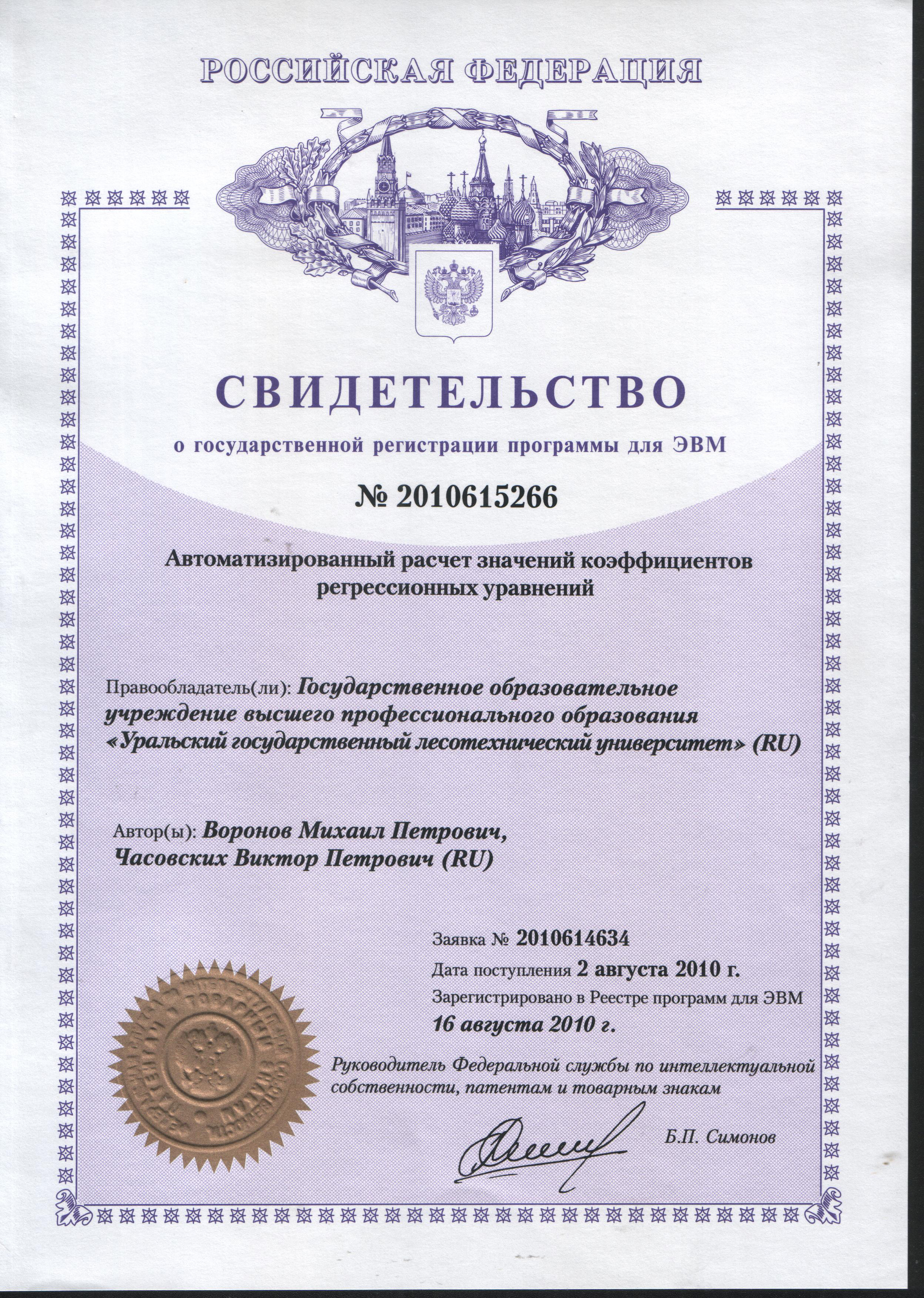2 | СВИДЕТЕЛЬСТВО о государственной регистрации программ для ЭВМ | Программа формирования заявления о допуске абитуриента к вступительным испытаниям для поступления в вуз | Часовских | 2019613662 | 21 марта 2019 г. | Федеральное государственное бюджетное образовательное учреждение высшего образования «Уральский государственный лесотехнический университет» (RU | Часовских Виктор Петрович (RU), Воронов Михаил Петрович (RU) | 2019612423 | 14 марта 2019 г. | Посмотреть |