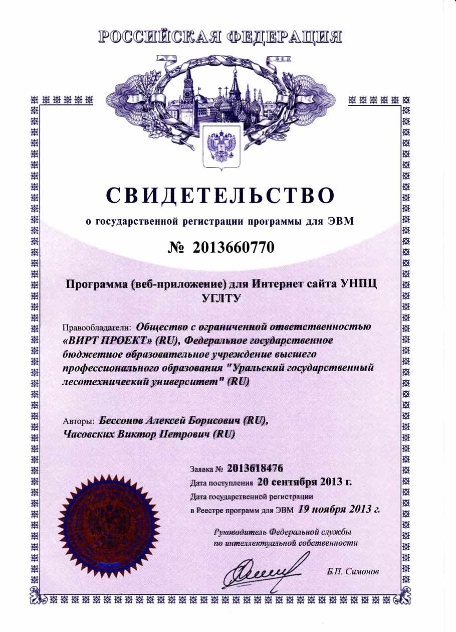41 | Свидетельство о государственной регистрации программы для ЭВМ | Программа (веб-приложение) для управлении файловой системой Интернет сайтов | Часовских | 2014611836 | 11 февраля 2014 г. | Общество с ограниченной ответственностью «ВИРТ ПРОЕКТ» (RU), Федеральное государственное бюджетное обраюватсльное учреждение высшего профессионального обраювания «Уральский государственный лесотехнический университет» (RU) | Бессонов Алексей Борисович (RU). Часовских Виктор Петрович (RU) | 2013661544 | 12 декабря 2013 г. | Посмотреть |