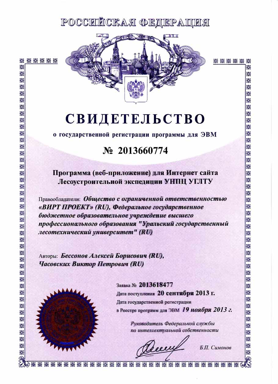 36 | СВИДЕТЕЛЬСТВО о государственной регистрации программы для ЭВМ | Программа (веб-приложение) для Интернет сайта Лесоустроительной экспедиции УНПЦ УГЛТУ | Часовских | 2013660774 | 19 Ноября 2013 г. | Общество с ограниченной ответственностью «ВИРТ ПРОЕКТ» (RU), Федеральное государственное бюджетное образовательное учреждение высшего профессионального образования "Уральский государственный лесотехнический университет " (RU) | Бессонов Алексей Борисович (RU), Часовских Виктор Петрович (RU) | 2013618477 | 20 сентября 2013 г. | Посмотреть |