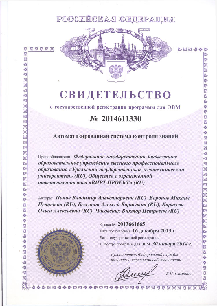 4 | СВИДЕТЕЛЬСТВО о государственной регистрации программы для ЭВМ | Автоматизированная система контроля знаний | Часовских | 2014611330 | 30 января 2014 г. | Федеральное государственное бюджетное образовательное учреждение высшего профессионального образования «Уральский государственный лесотехнический университет» (RI', 23, NULL), Общество с ограниченной ответственностью «ВИРТ ПРОЕКТ» (RU) | Попов Владимир Александрович (RU), Воронов Михаил Петрович (RU), Бессонов Алексей Борисович (RV), Карасева Ольга Алексеевна (RU), Часовских Виктор Петрович (RU) | 2013661665 | 16 декабря 2013 Г | Посмотреть |