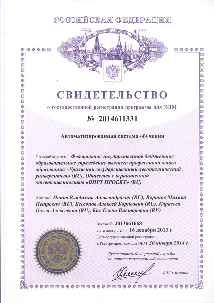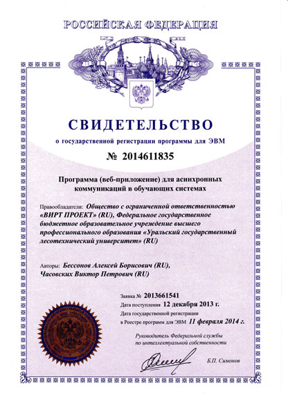 34 | Свидетельство о государственной регистрации программы для ЭВМ | Программа (веб-приложение) для асинхронных коммуникаций н обучающих системах | Часовских | 2014611835 | 12 февраля 2014 г. | Федеральное государственное бюджетное образовательное учреждение высшего профессионального образования «Уральский государственный лесотехнический университет» (RU), Общество с ограниченной ответственностью «ВИРТ ПРОЕКТ» (RV) | Бессонов Алексей Борисович (RU), Часовских Виктор Петрович (RU) | 2013661541 | 12 декабря 2013 г. | Посмотреть |