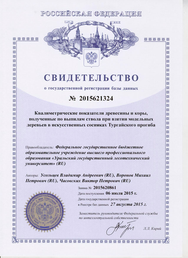26 | Свидетельство о государственной регистрации базы данных | Квалиметрическне показатели древесины и коры,полученные но выпилам ствола при взятии модельных деревьев в искусственных сосняках Тургайского прогиба | Часовских | 2015621324 | 27 августа 2015 г. | Федеральное государственное бюджетное образовательное учреждение высшего профессионального образования «Уральский государственный лесотехнический университет» (RU) | Владимир Андреевич (RU), Воронов Михаил Петрович (RU), Часовских Виктор Петрович (RU) | 2015620861 | 06 июля 2015 г. | Посмотреть |