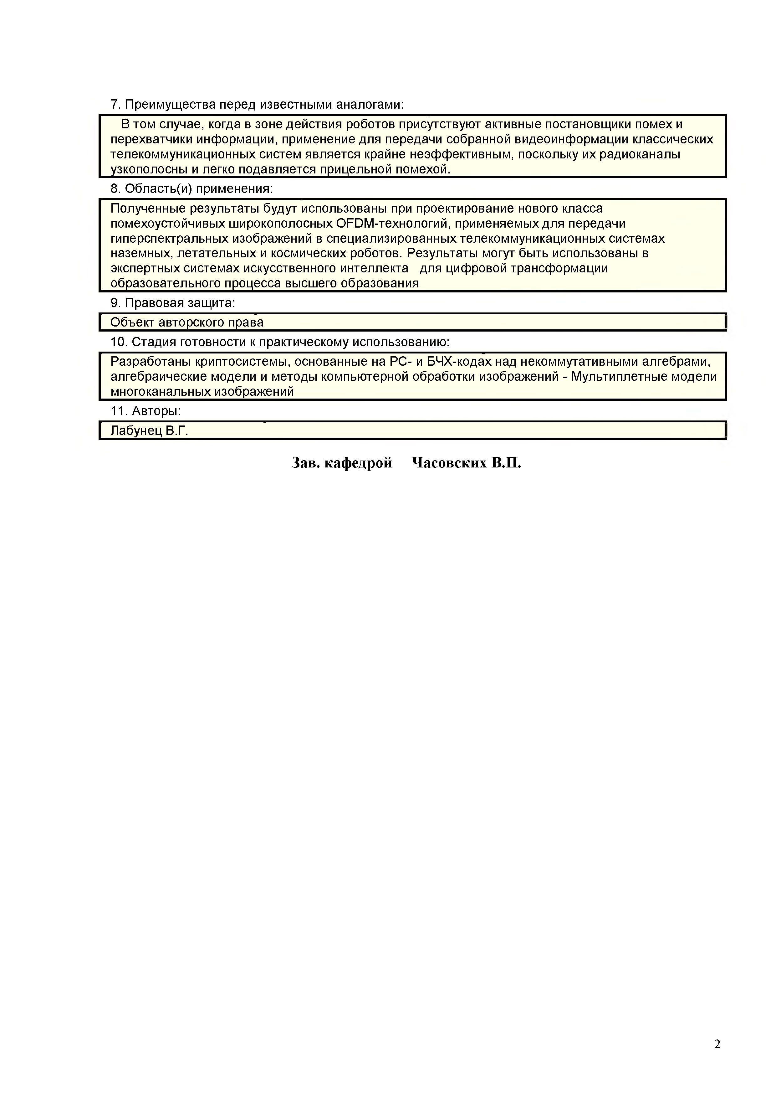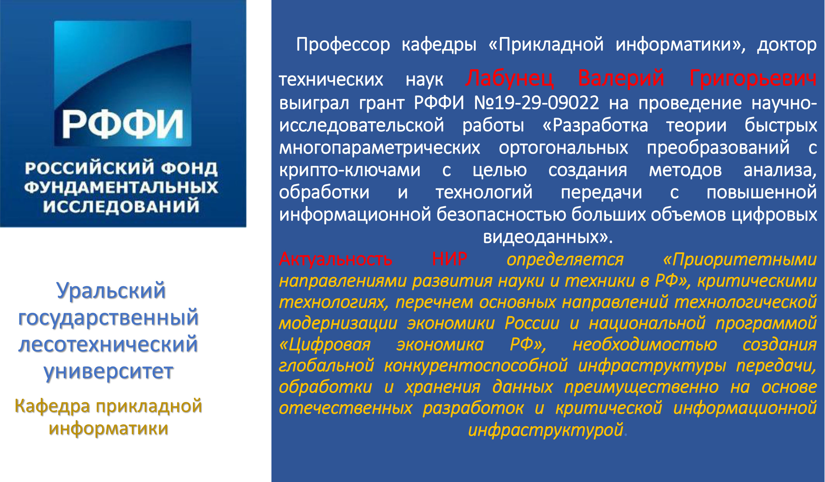 Лидером в теории и практике искусственного интеллекта в г. Екатеринбург, УГЛТУ является профессор кафедры ПИ Лабунец В.Г. Был научным руководителем в 2018-2019 году НИР «Быстрые многопараметрические комплементарные преобразования для обобщенной OFDM-технологии передачи данных». РФФИ №17-07-00886, объем финансирования – 1200 тыс. руб. в год. Является научным руководителем 2020 года – 2022 году НИР «Разработка теории быстрых многопараметрических ортогональных преобразований с крипто-ключами с целью создания методов анализа, обработки и технологий передачи с повышенной информационной безопасностью больших объемов цифровых видеоданных». Грант РФФИ-№19-29-09022, общим объемом 11500 тыс. руб. С 2021 года данная НИР выполняется в другом университете, поскольку кафедра ПИ УГЛТУ ликвидирована. Лабунец В.Г. и Часовских В.П. являются членами бюро Уральского регионального отделения Национального комитета по распознаванию образов и анализу изображений Российской Академии Наук РФ. Являются членами постоянно действующего Международного междисциплинарного семинара «Алгебраическая биология, теория систем и искусственный интеллект» Научного совета при президиуме РАН по методологии искусственного интеллекта и когнитивных исследований. Гранты РФФИ №17-07-00886 и РФФИ-№19-29-09022, являясь фундаментальными НИР РФ вывели кафедру ПИ УГЛТУ в лидеры применения технологий искусственного интеллекта во всех сферах экономики РФ. Профессор кафедры ПИ УГЛТУ Шерпаев Владимир Иванович представлял кафедру ПИ УГЛТУ в научном секторе обеспечения информационной безопасности.