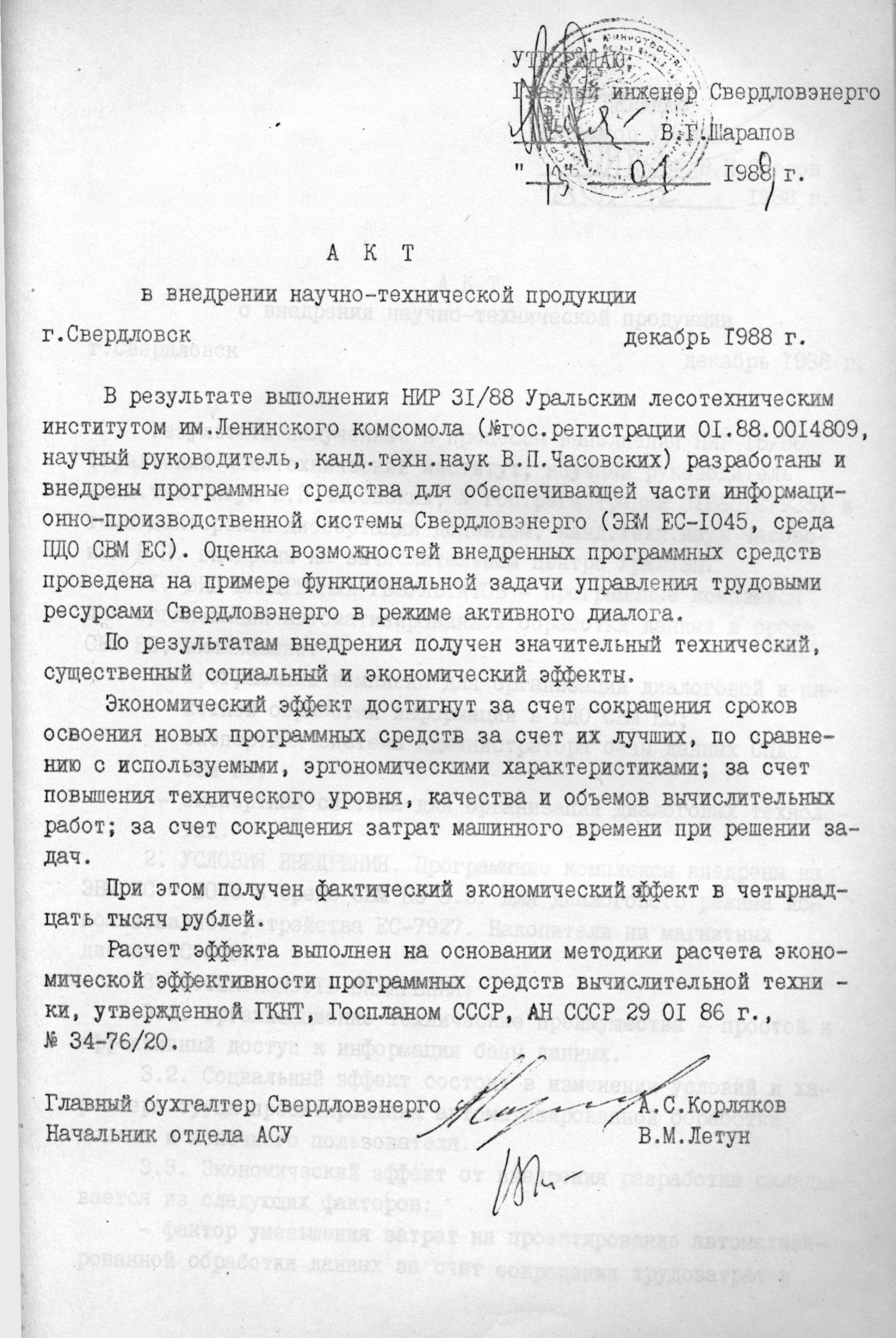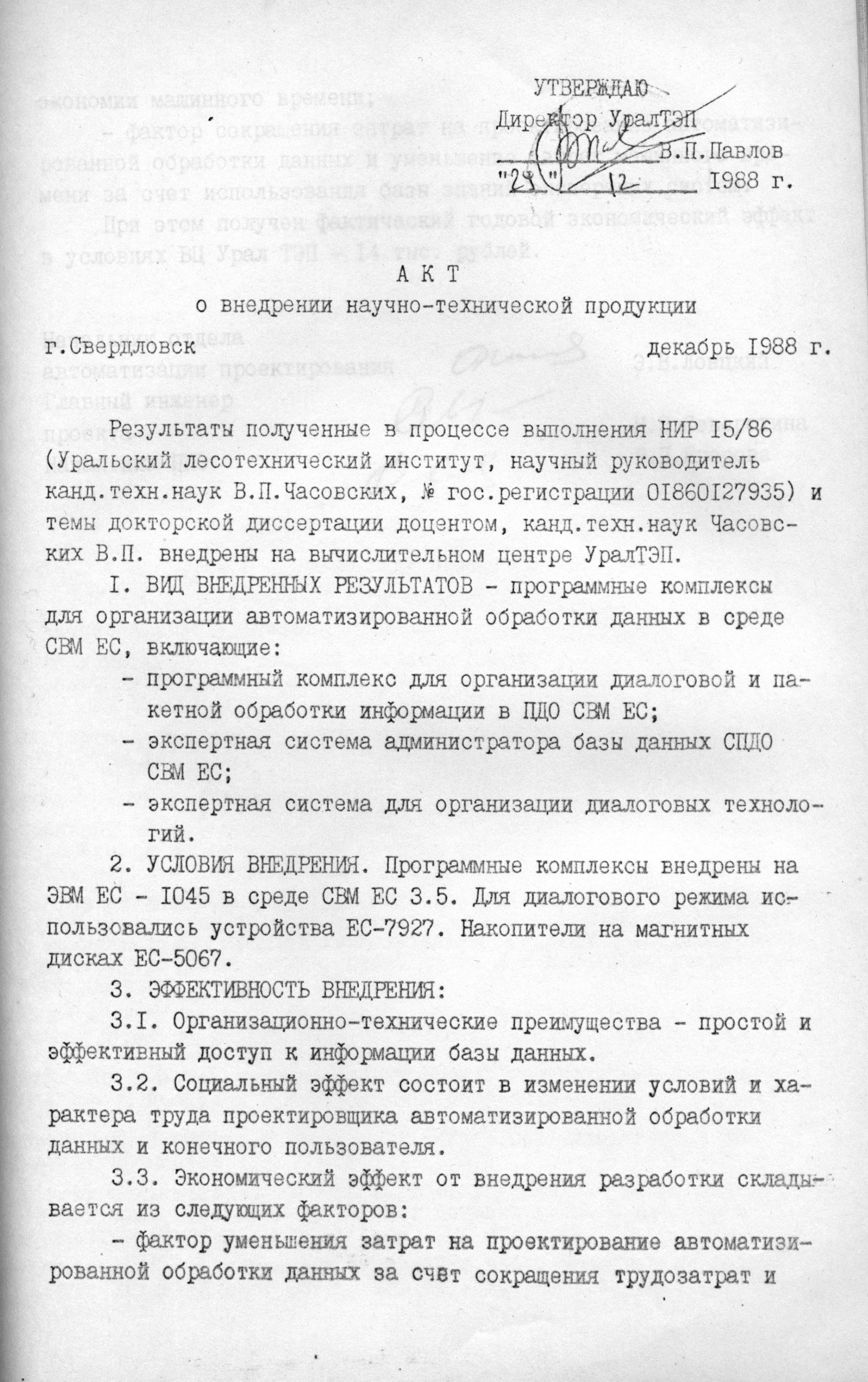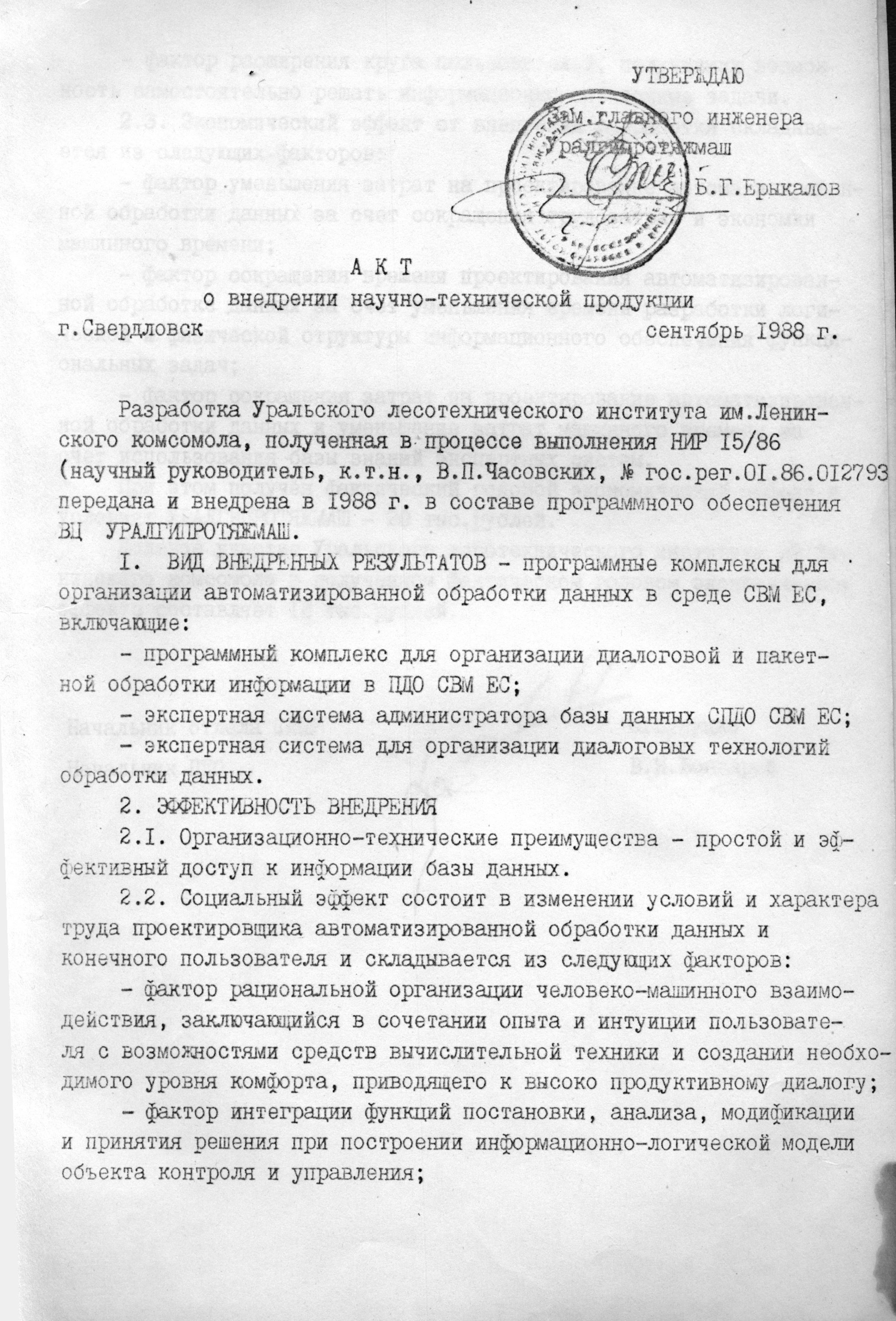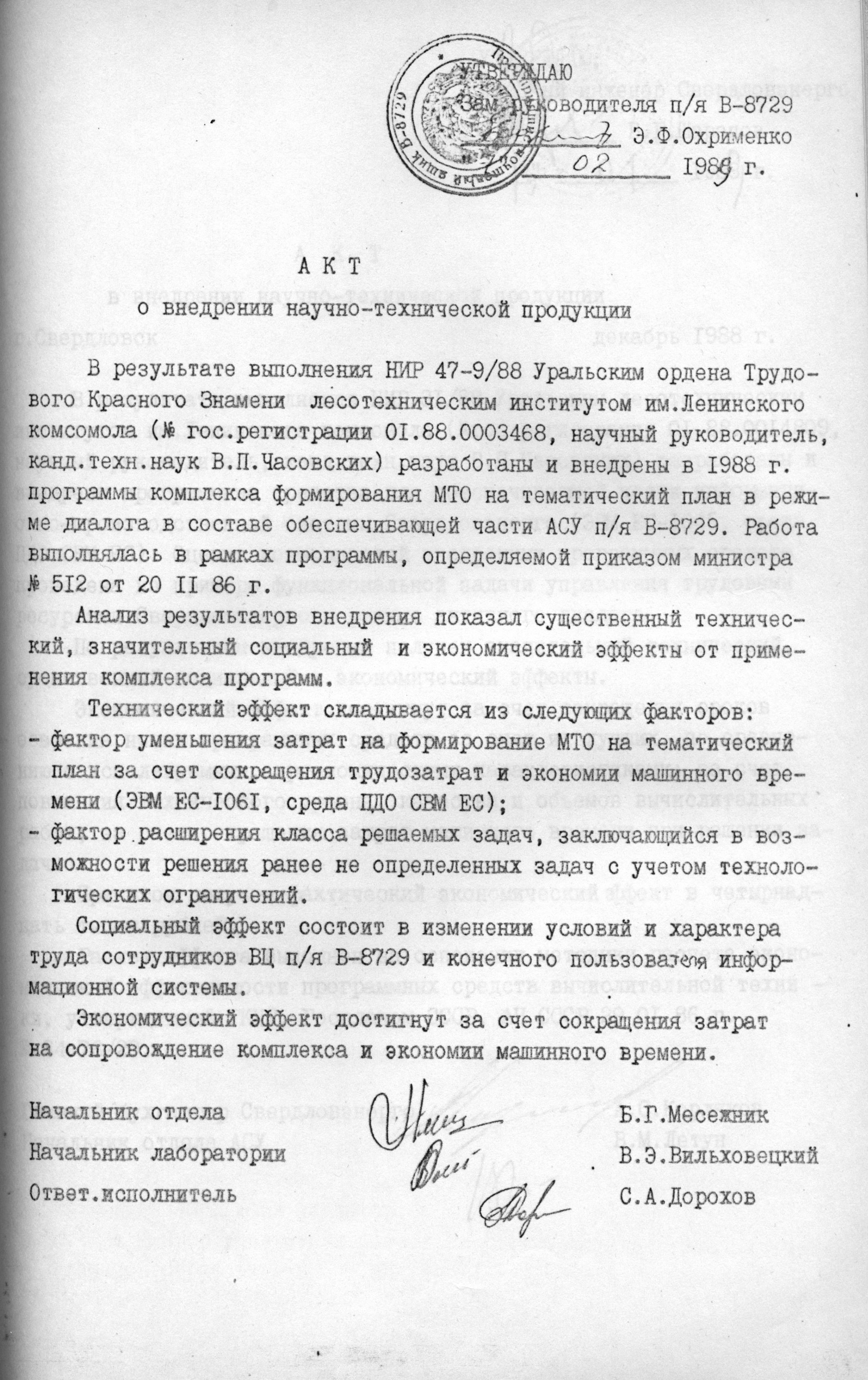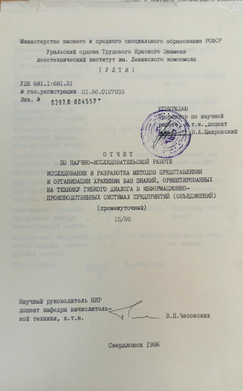 В середине 60-х годов 20-го века на радиотехническом факультете УПИ, в лаборатории №2, под руководством молодого ученого Попова Владимира Александровича (к.т.н., доцент) начали выполняться исследования по созданию и применению вычислительной техники в интересах обороны и народного хозяйства СССР. В 1967 году в эту лабораторию для участия в НИР был приглашен студент 2-го курса Часовских Виктор Петрович. Его руководителем был назначен Трыков Ю.В. При внедрении научных результатов Попова В.А. были созданы и приняты заказчиком уникальные вычислительные машины для летательных аппаратов. В 1969 году Попов В.А. пригласил в свою лабораторию двух студентов Тихоцкого Анатолия Игоревича и Хизунова Николай Михайловича. Их успехи в исследованиях были уникальными. Студенты закончили РТФ и остались работать в коллективе Попова В.А. Этот коллектив был хорошо известен в оборонной промышленности и ему были предложены работы по применению вычислительных машин для создания информационных систем различного назначения. Ректор УПИ Заостровский Ф.П. предложил возглавить работы по созданию АСУ УПИ. Часовских В.П. стал дополнительно системным программистом ВЦ УПИ и начал выполнять работы класса искусственного интеллекта, была создана и внедрена в эксплуатацию информационная система управления кадрами с моделями принятия решений в условиях неопределенности. Уникальные модели автоматизированного управления вузом, предложенные Поповым В.А., вызвали большой интерес Минвуза РСФСР, и он со своим коллективом был приглашен в программу создания ОАСУ Минвуза РСФСР и разработки типовой АСУ ВУЗ. Работы Часовских В.П. вызвали интерес Минрадиопрома, его группе была предложена НИР в интересах машиностроительных предприятий оборонной промышленности. К 1967 году научный коллектив Попова В.А. стал хорошо известен своими компетенциями в применении ЭВМ в широком спектре задач. В 1967 году началась программа всеобщей автоматизации высшего образования СССР (примерно тоже самое, что в 2020 г. цифровая трансформация лесного хозяйства). Ректор УЛТИ Казанцев Е.И. сделал предложение Попову В.А. перейти со своим коллективом в УЛТИ. Коллектив в это время плавал в бассейне «Юность», обсудили предложение и решили пойти работать в УЛТИ. Евгений Иванович вызывал доверие и уважение. Последняя НИР в УПИ была следующая.
