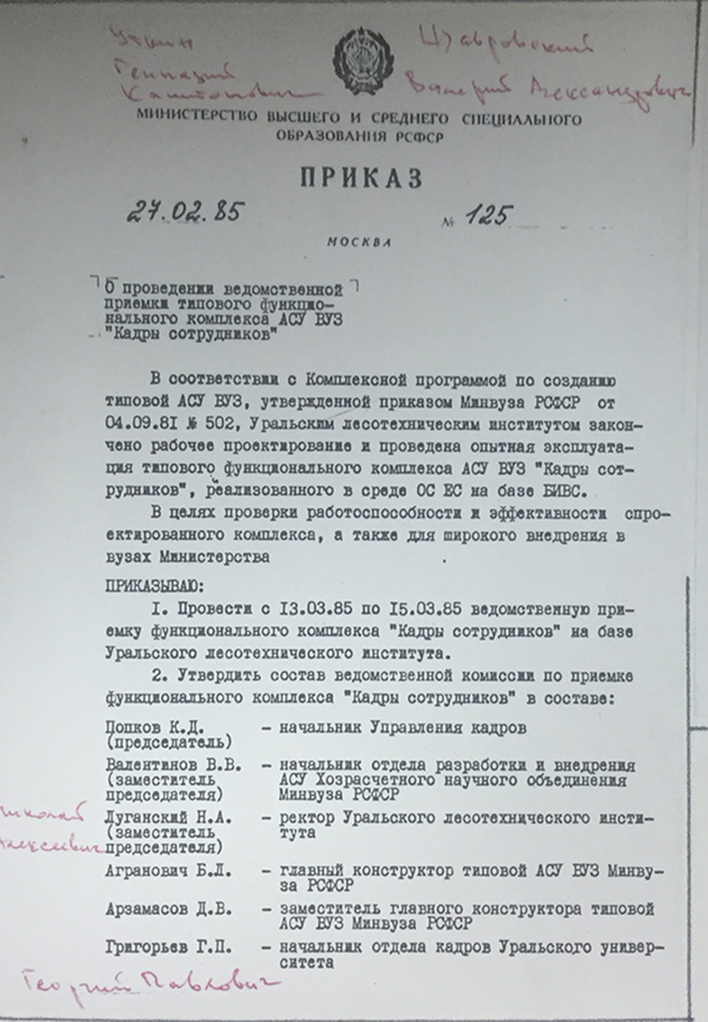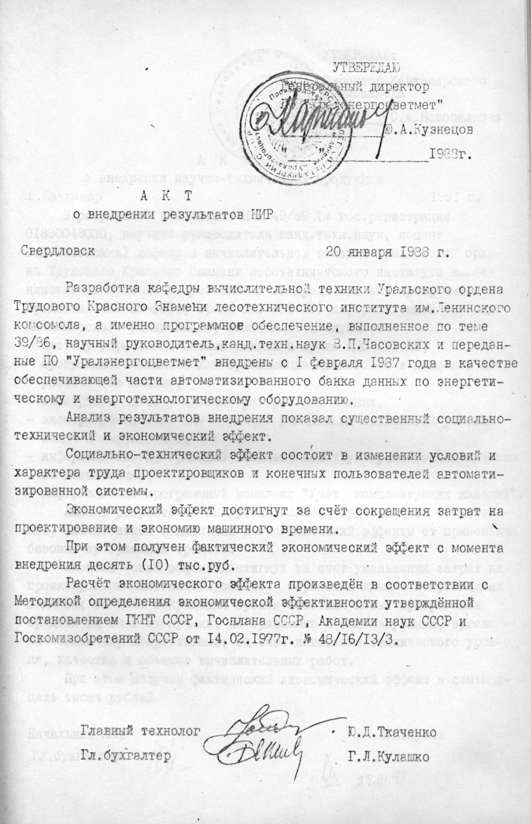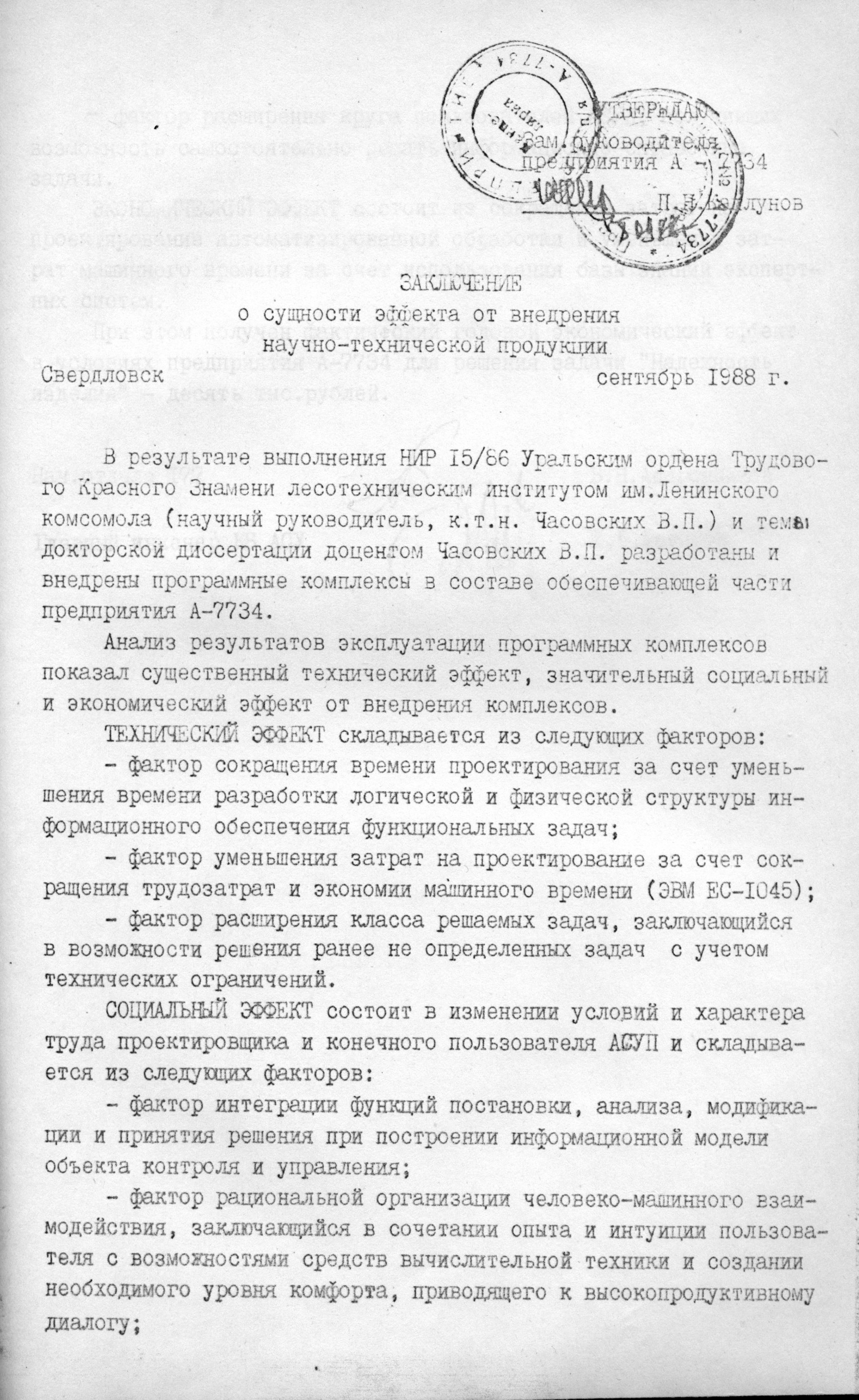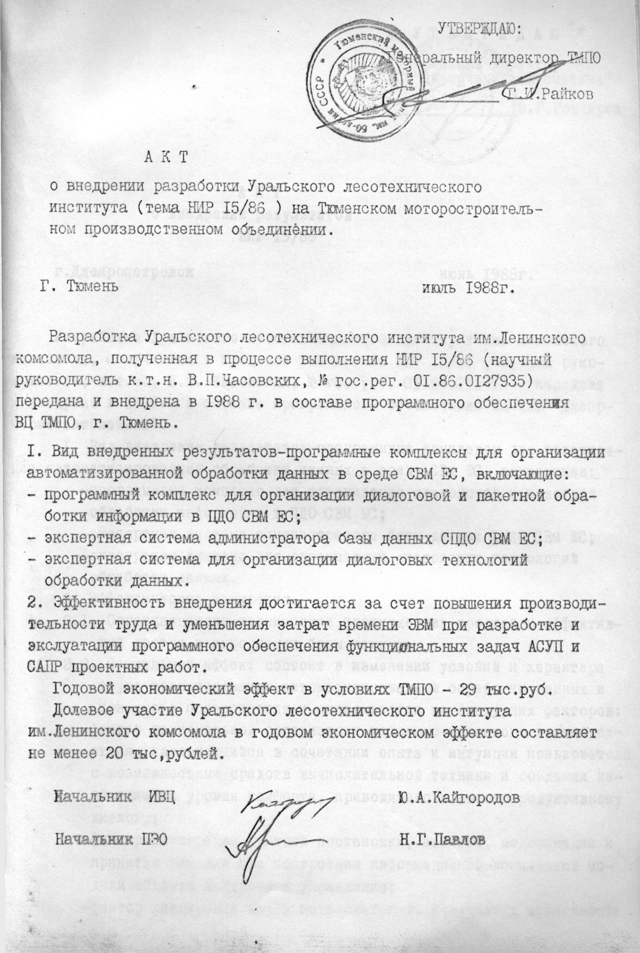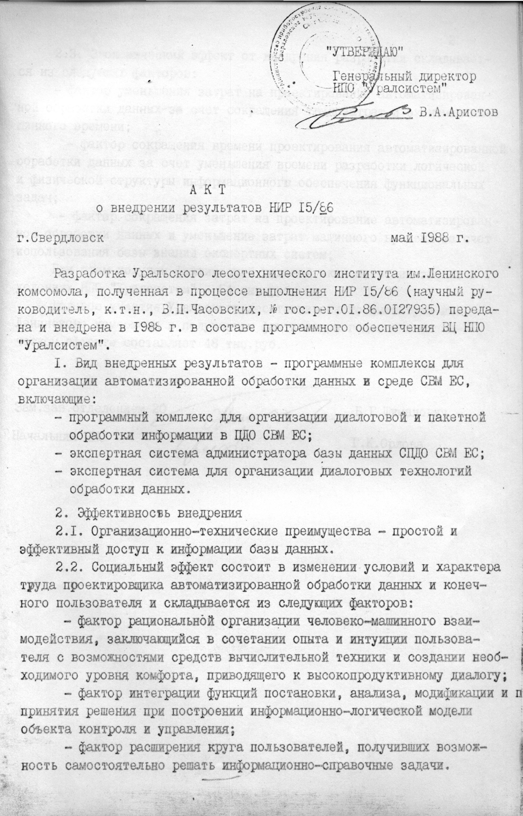 В середине 60-х годов 20-го века на радиотехническом факультете УПИ, в лаборатории №2, под руководством молодого ученого Попова Владимира Александровича (к.т.н., доцент) начали выполняться исследования по созданию и применению вычислительной техники в интересах обороны и народного хозяйства СССР. В 1967 году в эту лабораторию для участия в НИР был приглашен студент 2-го курса Часовских Виктор Петрович. Его руководителем был назначен Трыков Ю.В. При внедрении научных результатов Попова В.А. были созданы и приняты заказчиком уникальные вычислительные машины для летательных аппаратов. В 1969 году Попов В.А. пригласил в свою лабораторию двух студентов Тихоцкого Анатолия Игоревича и Хизунова Николай Михайловича. Их успехи в исследованиях были уникальными. Студенты закончили РТФ и остались работать в коллективе Попова В.А. Этот коллектив был хорошо известен в оборонной промышленности и ему были предложены работы по применению вычислительных машин для создания информационных систем различного назначения. Ректор УПИ Заостровский Ф.П. предложил возглавить работы по созданию АСУ УПИ. Часовских В.П. стал дополнительно системным программистом ВЦ УПИ и начал выполнять работы класса искусственного интеллекта, была создана и внедрена в эксплуатацию информационная система управления кадрами с моделями принятия решений в условиях неопределенности. Уникальные модели автоматизированного управления вузом, предложенные Поповым В.А., вызвали большой интерес Минвуза РСФСР, и он со своим коллективом был приглашен в программу создания ОАСУ Минвуза РСФСР и разработки типовой АСУ ВУЗ. Работы Часовских В.П. вызвали интерес Минрадиопрома, его группе была предложена НИР в интересах машиностроительных предприятий оборонной промышленности. К 1967 году научный коллектив Попова В.А. стал хорошо известен своими компетенциями в применении ЭВМ в широком спектре задач. В 1967 году началась программа всеобщей автоматизации высшего образования СССР (примерно тоже самое, что в 2020 г. цифровая трансформация лесного хозяйства). Ректор УЛТИ Казанцев Е.И. сделал предложение Попову В.А. перейти со своим коллективом в УЛТИ. Коллектив в это время плавал в бассейне «Юность», обсудили предложение и решили пойти работать в УЛТИ. Евгений Иванович вызывал доверие и уважение. Последняя НИР в УПИ была следующая.