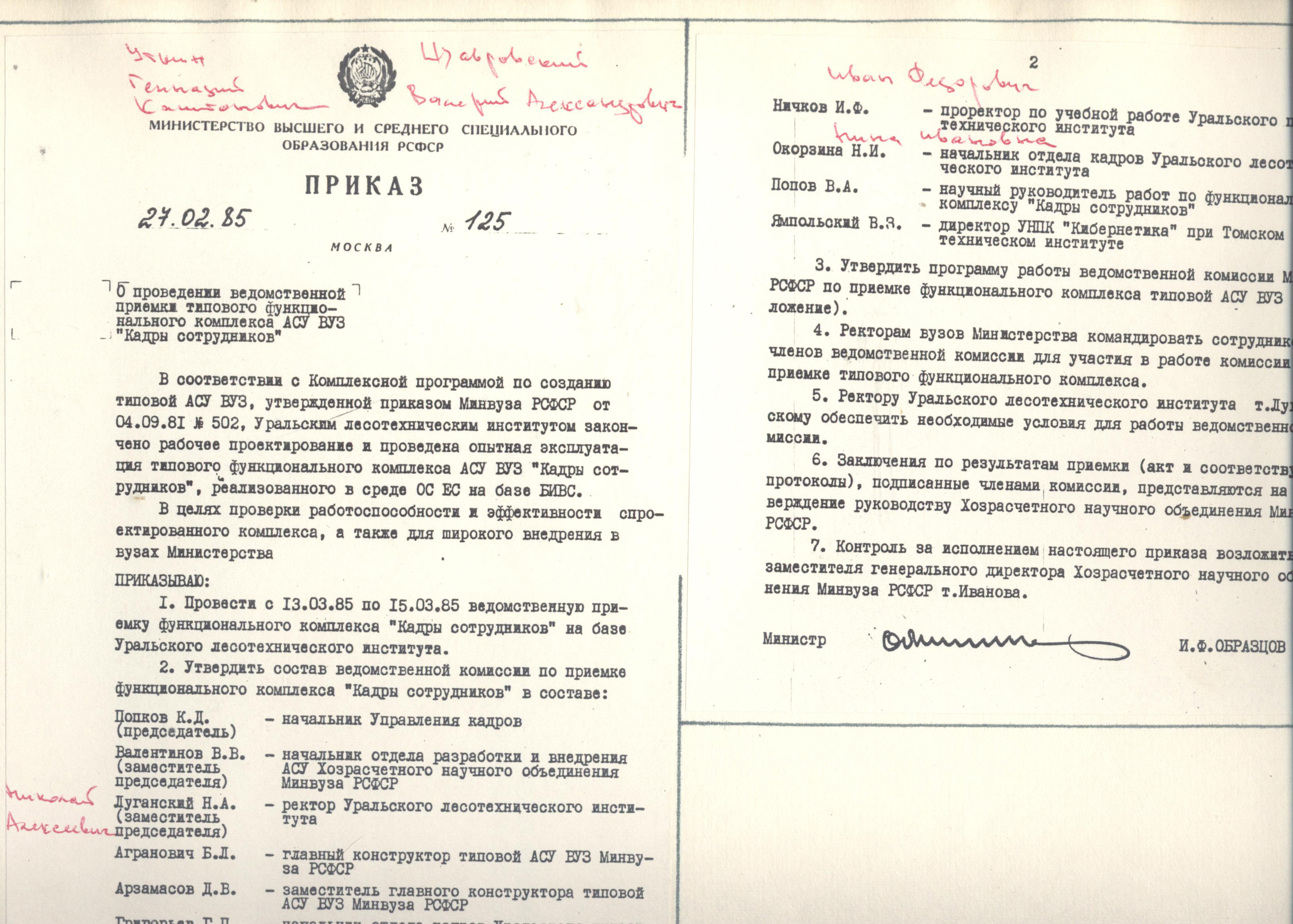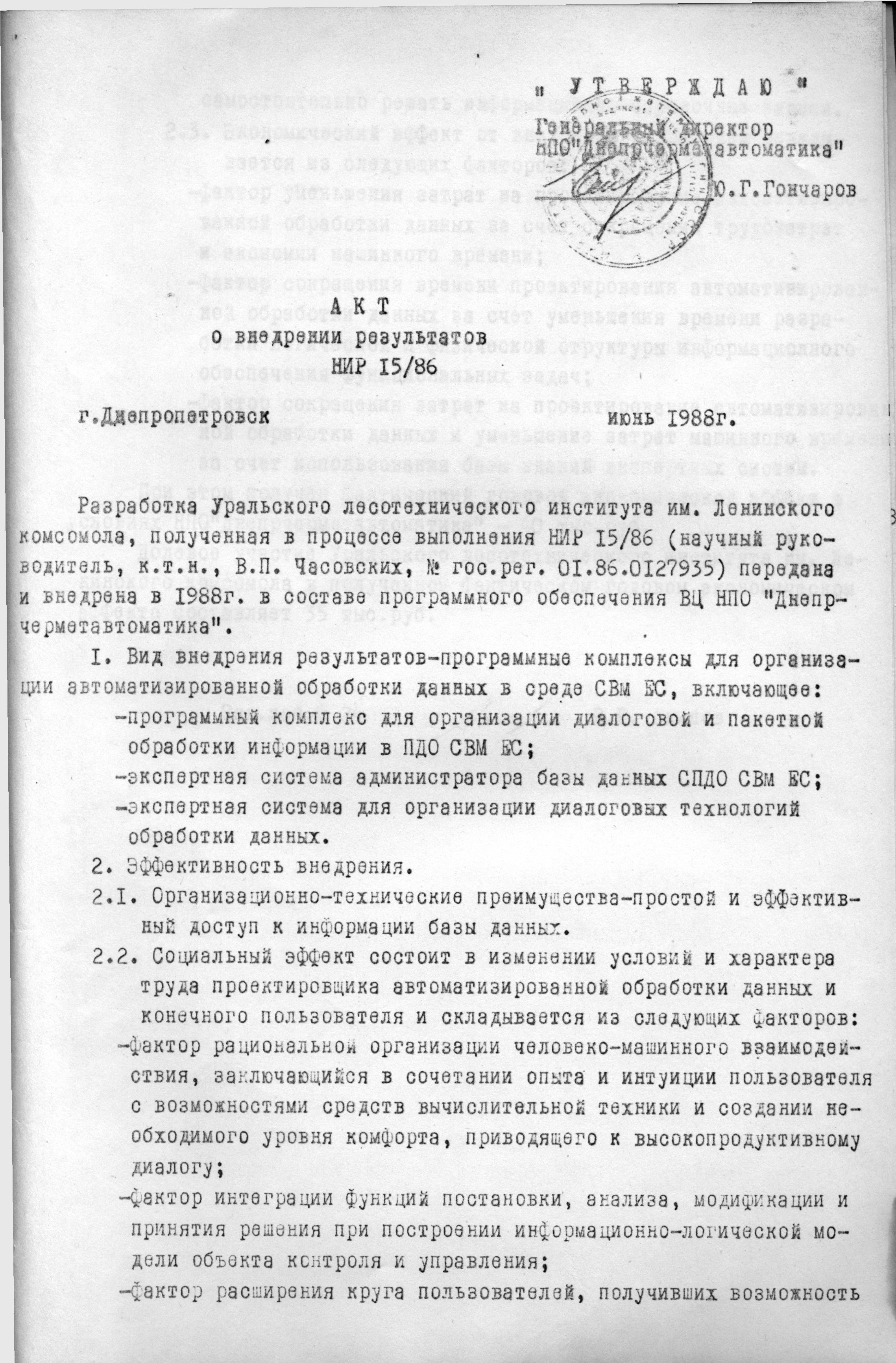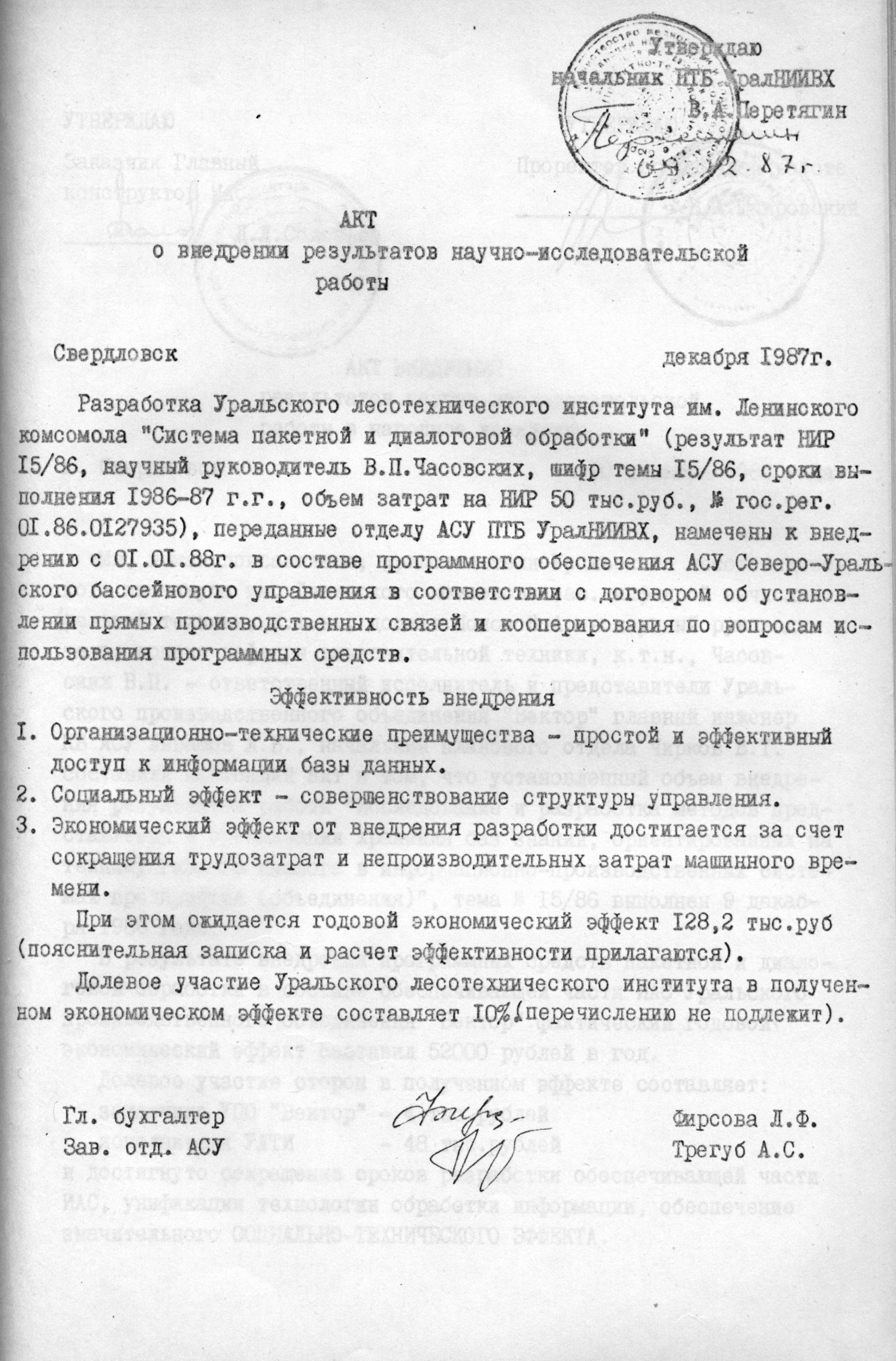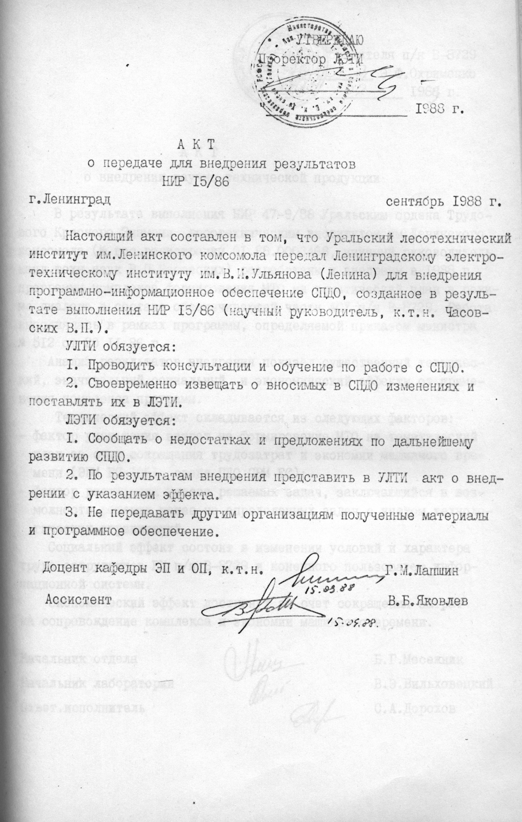 В середине 60-х годов 20-го века на радиотехническом факультете УПИ, в лаборатории №2, под руководством молодого ученого Попова Владимира Александровича (к.т.н., доцент) начали выполняться исследования по созданию и применению вычислительной техники в интересах обороны и народного хозяйства СССР. В 1967 году в эту лабораторию для участия в НИР был приглашен студент 2-го курса Часовских Виктор Петрович. Его руководителем был назначен Трыков Ю.В. При внедрении научных результатов Попова В.А. были созданы и приняты заказчиком уникальные вычислительные машины для летательных аппаратов. В 1969 году Попов В.А. пригласил в свою лабораторию двух студентов Тихоцкого Анатолия Игоревича и Хизунова Николай Михайловича. Их успехи в исследованиях были уникальными. Студенты закончили РТФ и остались работать в коллективе Попова В.А. Этот коллектив был хорошо известен в оборонной промышленности и ему были предложены работы по применению вычислительных машин для создания информационных систем различного назначения. Ректор УПИ Заостровский Ф.П. предложил возглавить работы по созданию АСУ УПИ. Часовских В.П. стал дополнительно системным программистом ВЦ УПИ и начал выполнять работы класса искусственного интеллекта, была создана и внедрена в эксплуатацию информационная система управления кадрами с моделями принятия решений в условиях неопределенности. Уникальные модели автоматизированного управления вузом, предложенные Поповым В.А., вызвали большой интерес Минвуза РСФСР, и он со своим коллективом был приглашен в программу создания ОАСУ Минвуза РСФСР и разработки типовой АСУ ВУЗ. Работы Часовских В.П. вызвали интерес Минрадиопрома, его группе была предложена НИР в интересах машиностроительных предприятий оборонной промышленности. К 1967 году научный коллектив Попова В.А. стал хорошо известен своими компетенциями в применении ЭВМ в широком спектре задач. В 1967 году началась программа всеобщей автоматизации высшего образования СССР (примерно тоже самое, что в 2020 г. цифровая трансформация лесного хозяйства). Ректор УЛТИ Казанцев Е.И. сделал предложение Попову В.А. перейти со своим коллективом в УЛТИ. Коллектив в это время плавал в бассейне «Юность», обсудили предложение и решили пойти работать в УЛТИ. Евгений Иванович вызывал доверие и уважение. Последняя НИР в УПИ была следующая.
