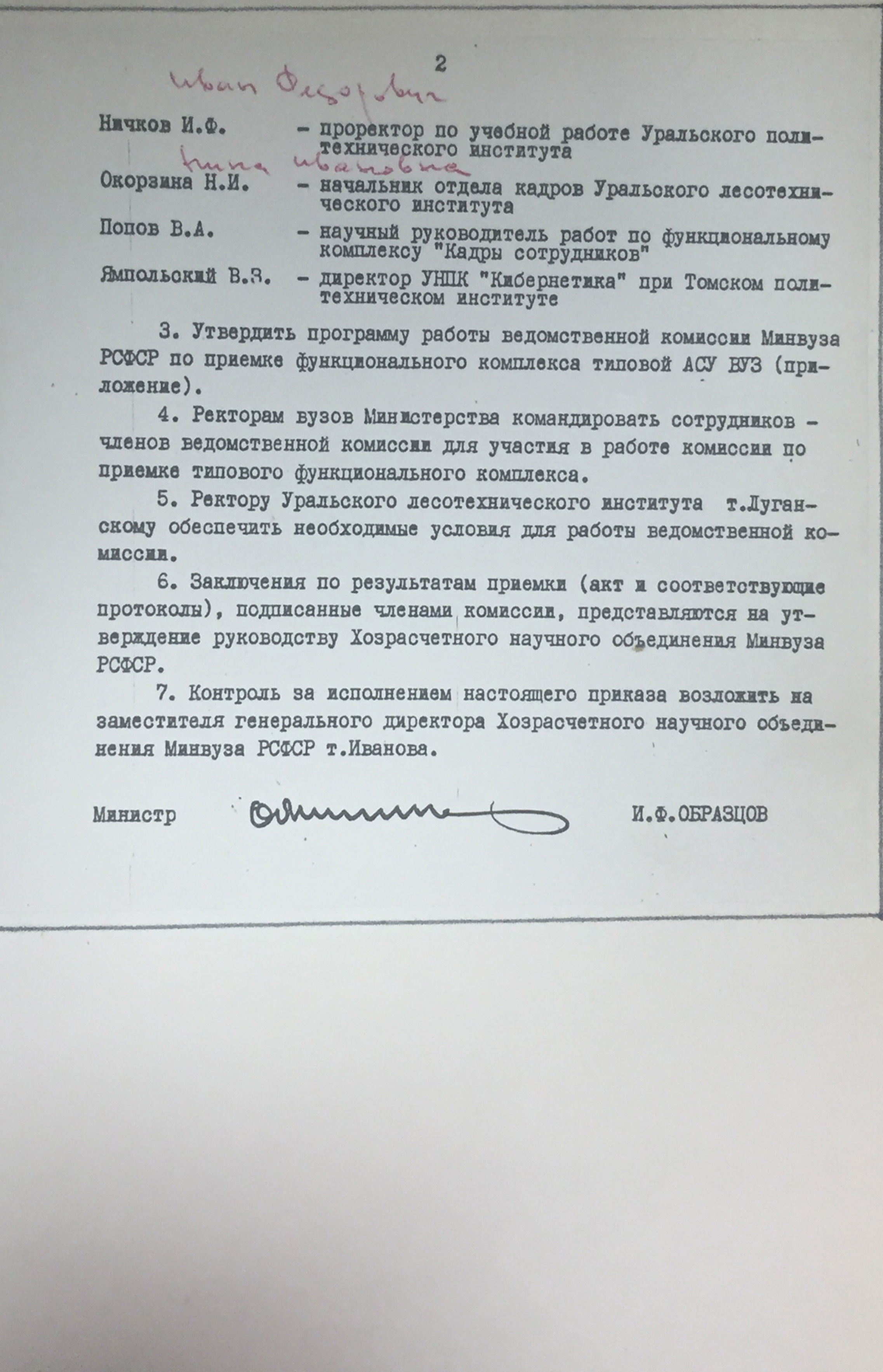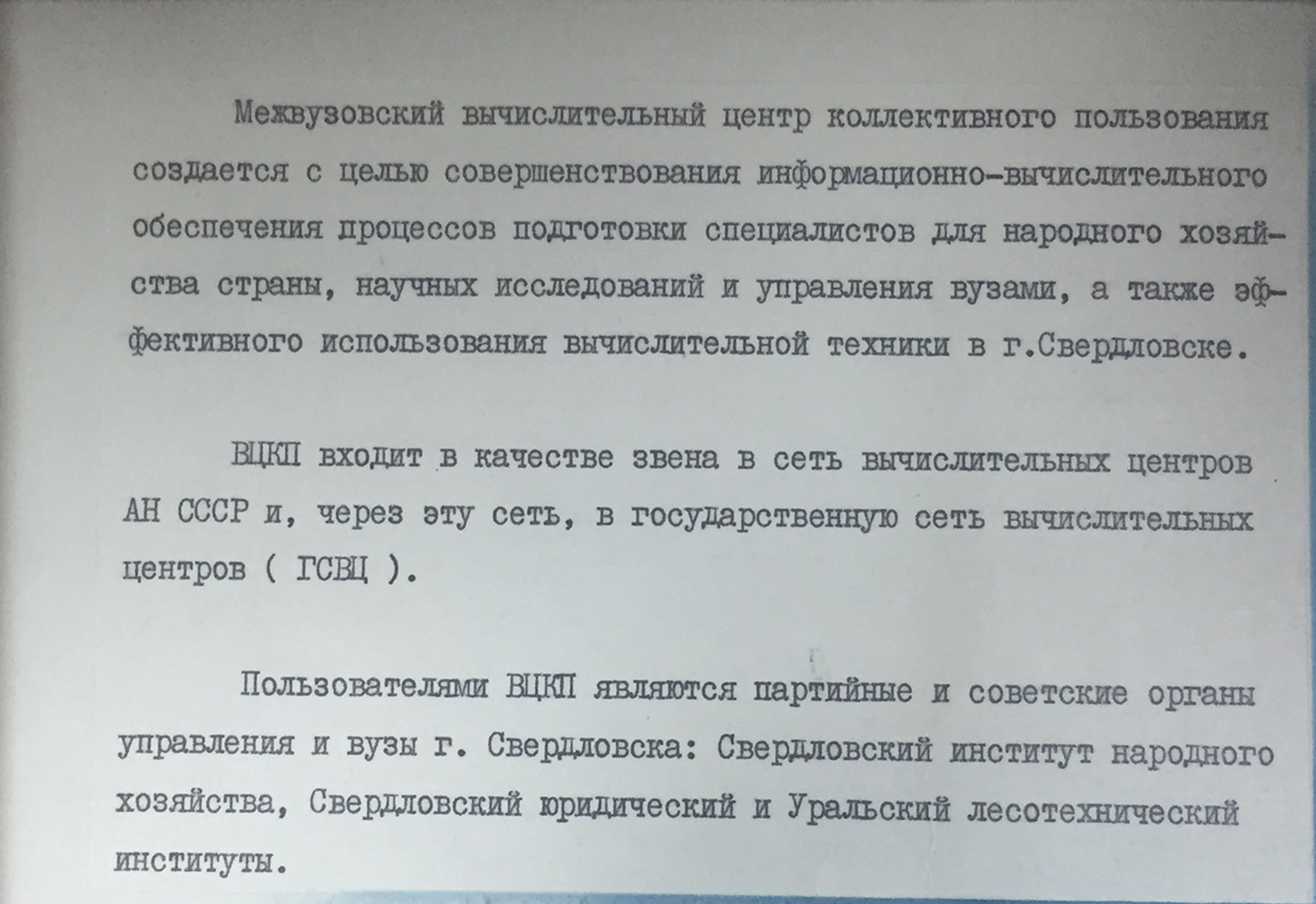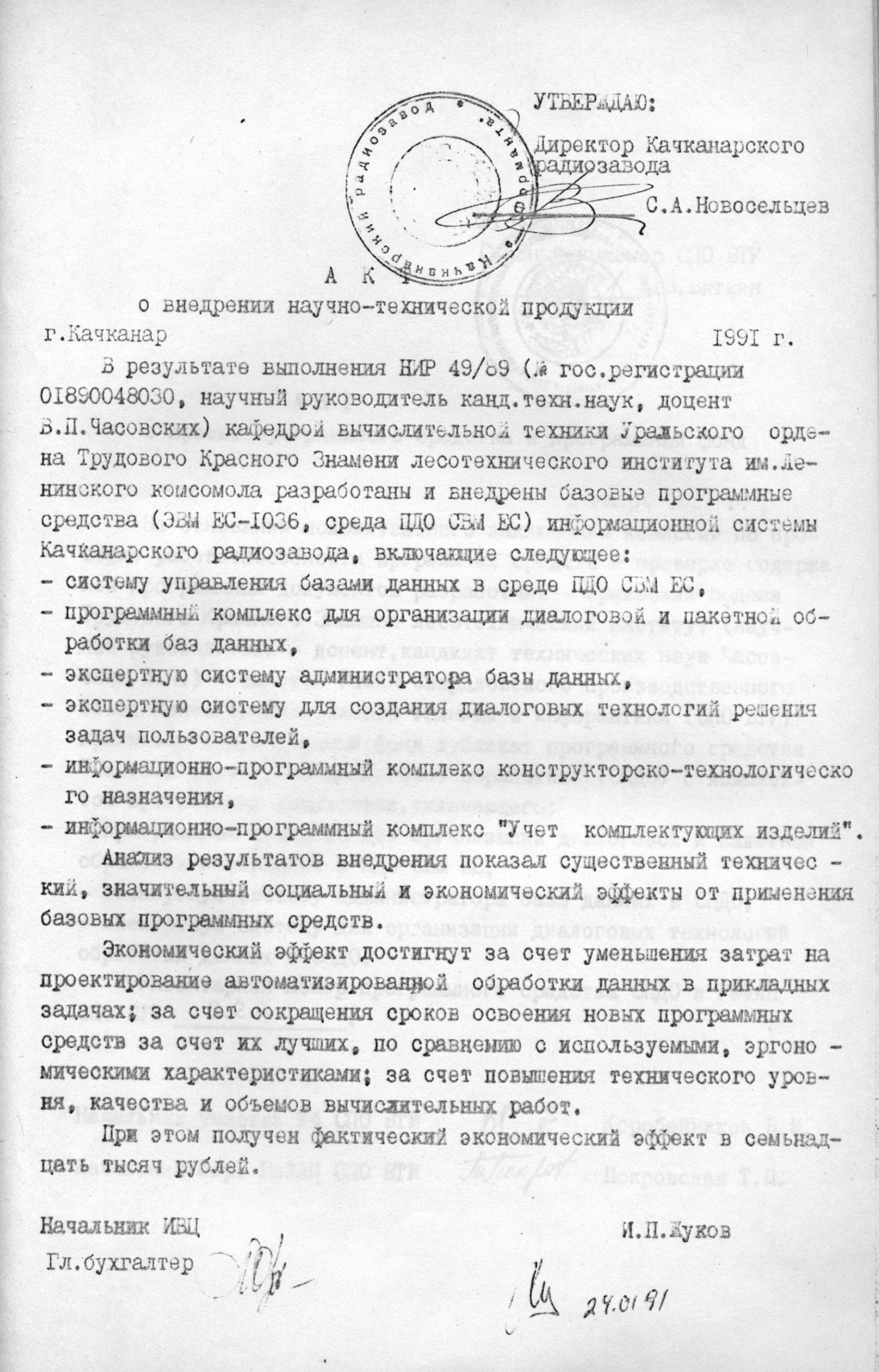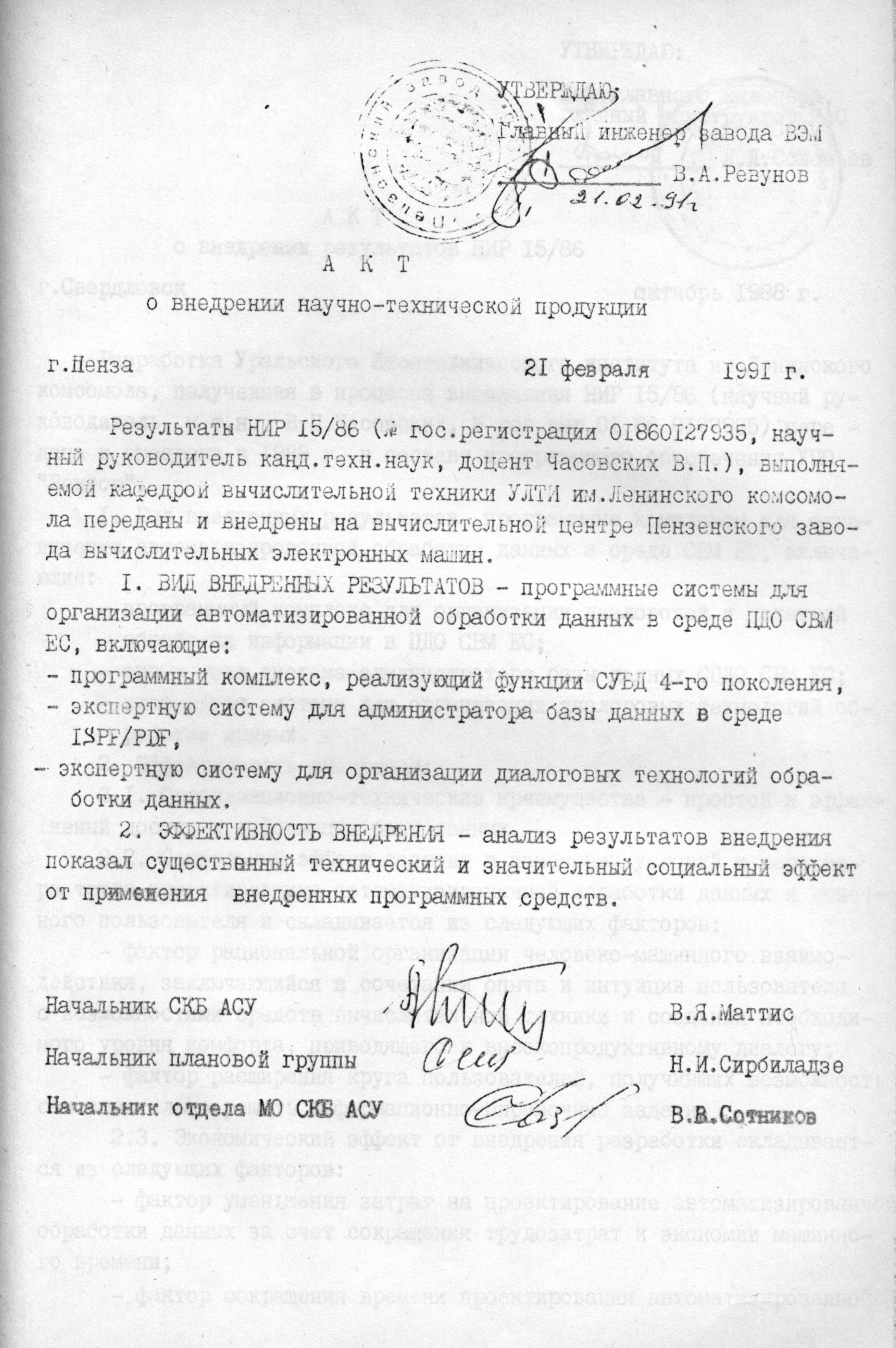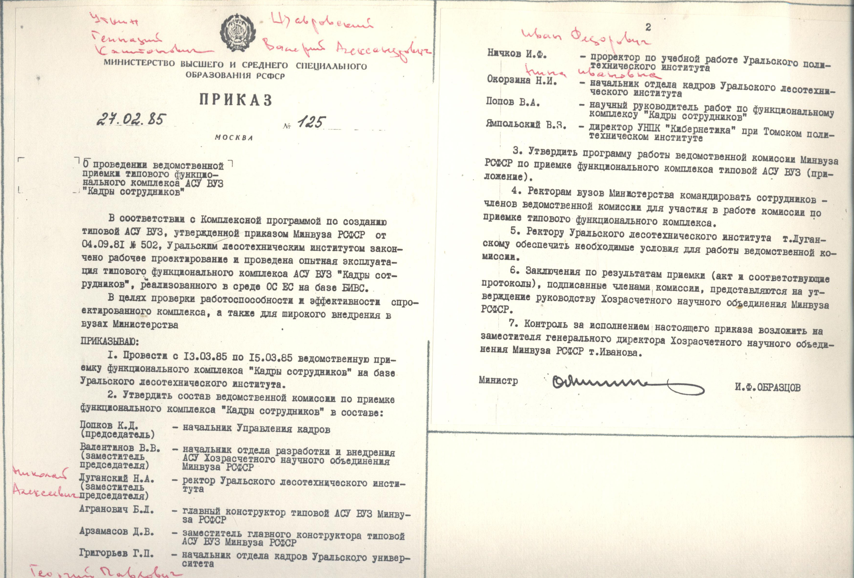 В середине 60-х годов 20-го века на радиотехническом факультете УПИ, в лаборатории №2, под руководством молодого ученого Попова Владимира Александровича (к.т.н., доцент) начали выполняться исследования по созданию и применению вычислительной техники в интересах обороны и народного хозяйства СССР. В 1967 году в эту лабораторию для участия в НИР был приглашен студент 2-го курса Часовских Виктор Петрович. Его руководителем был назначен Трыков Ю.В. При внедрении научных результатов Попова В.А. были созданы и приняты заказчиком уникальные вычислительные машины для летательных аппаратов. В 1969 году Попов В.А. пригласил в свою лабораторию двух студентов Тихоцкого Анатолия Игоревича и Хизунова Николай Михайловича. Их успехи в исследованиях были уникальными. Студенты закончили РТФ и остались работать в коллективе Попова В.А. Этот коллектив был хорошо известен в оборонной промышленности и ему были предложены работы по применению вычислительных машин для создания информационных систем различного назначения. Ректор УПИ Заостровский Ф.П. предложил возглавить работы по созданию АСУ УПИ. Часовских В.П. стал дополнительно системным программистом ВЦ УПИ и начал выполнять работы класса искусственного интеллекта, была создана и внедрена в эксплуатацию информационная система управления кадрами с моделями принятия решений в условиях неопределенности. Уникальные модели автоматизированного управления вузом, предложенные Поповым В.А., вызвали большой интерес Минвуза РСФСР, и он со своим коллективом был приглашен в программу создания ОАСУ Минвуза РСФСР и разработки типовой АСУ ВУЗ. Работы Часовских В.П. вызвали интерес Минрадиопрома, его группе была предложена НИР в интересах машиностроительных предприятий оборонной промышленности. К 1967 году научный коллектив Попова В.А. стал хорошо известен своими компетенциями в применении ЭВМ в широком спектре задач. В 1967 году началась программа всеобщей автоматизации высшего образования СССР (примерно тоже самое, что в 2020 г. цифровая трансформация лесного хозяйства). Ректор УЛТИ Казанцев Е.И. сделал предложение Попову В.А. перейти со своим коллективом в УЛТИ. Коллектив в это время плавал в бассейне «Юность», обсудили предложение и решили пойти работать в УЛТИ. Евгений Иванович вызывал доверие и уважение. Последняя НИР в УПИ была следующая.