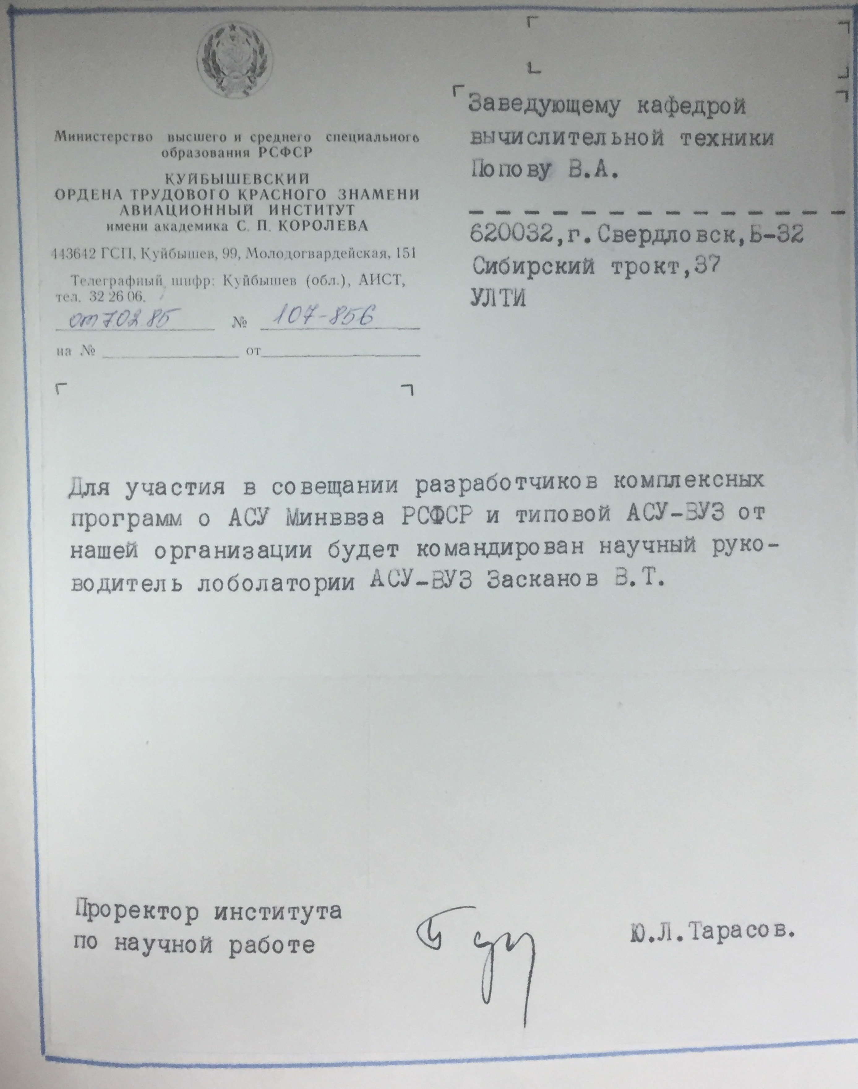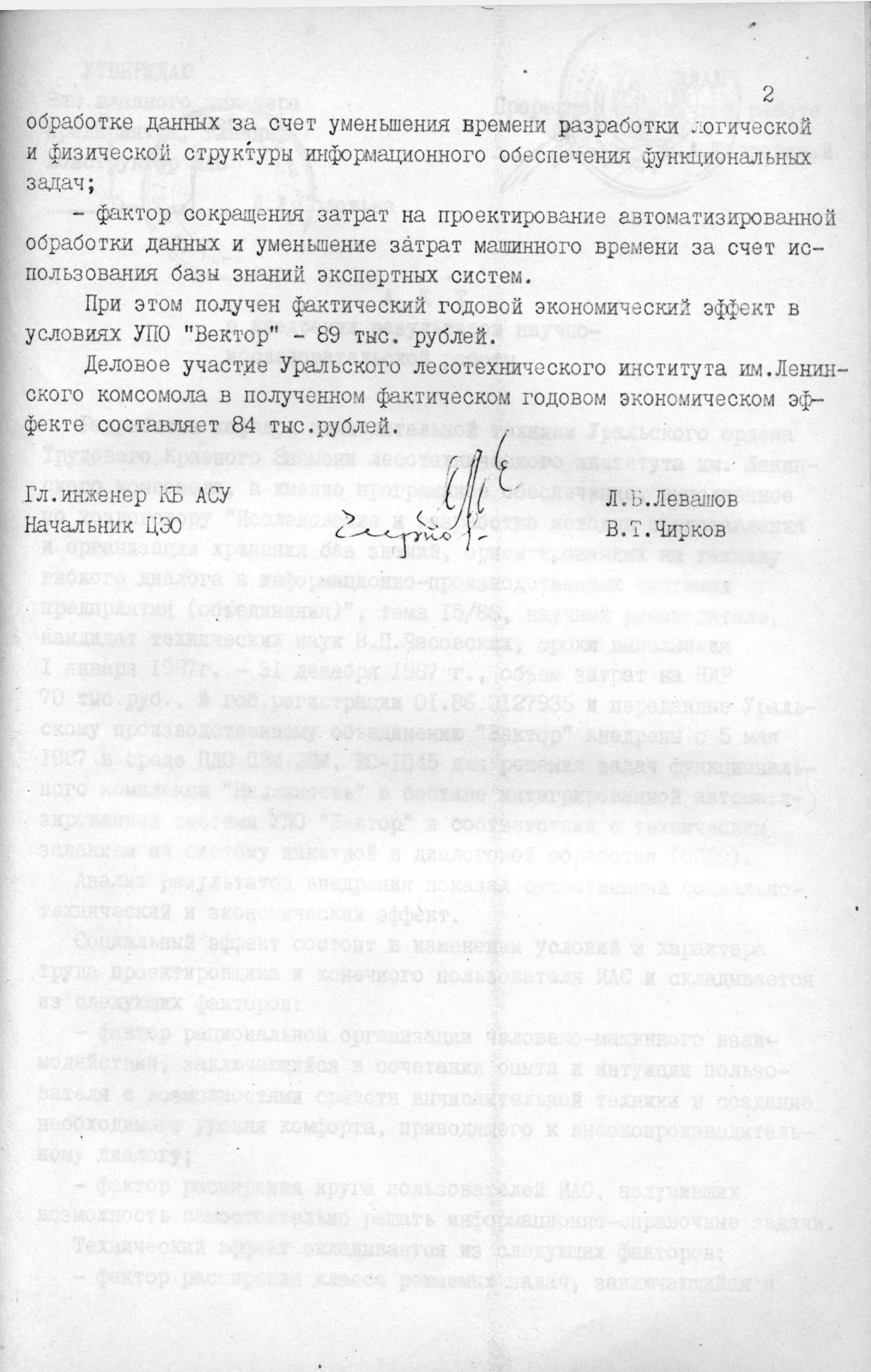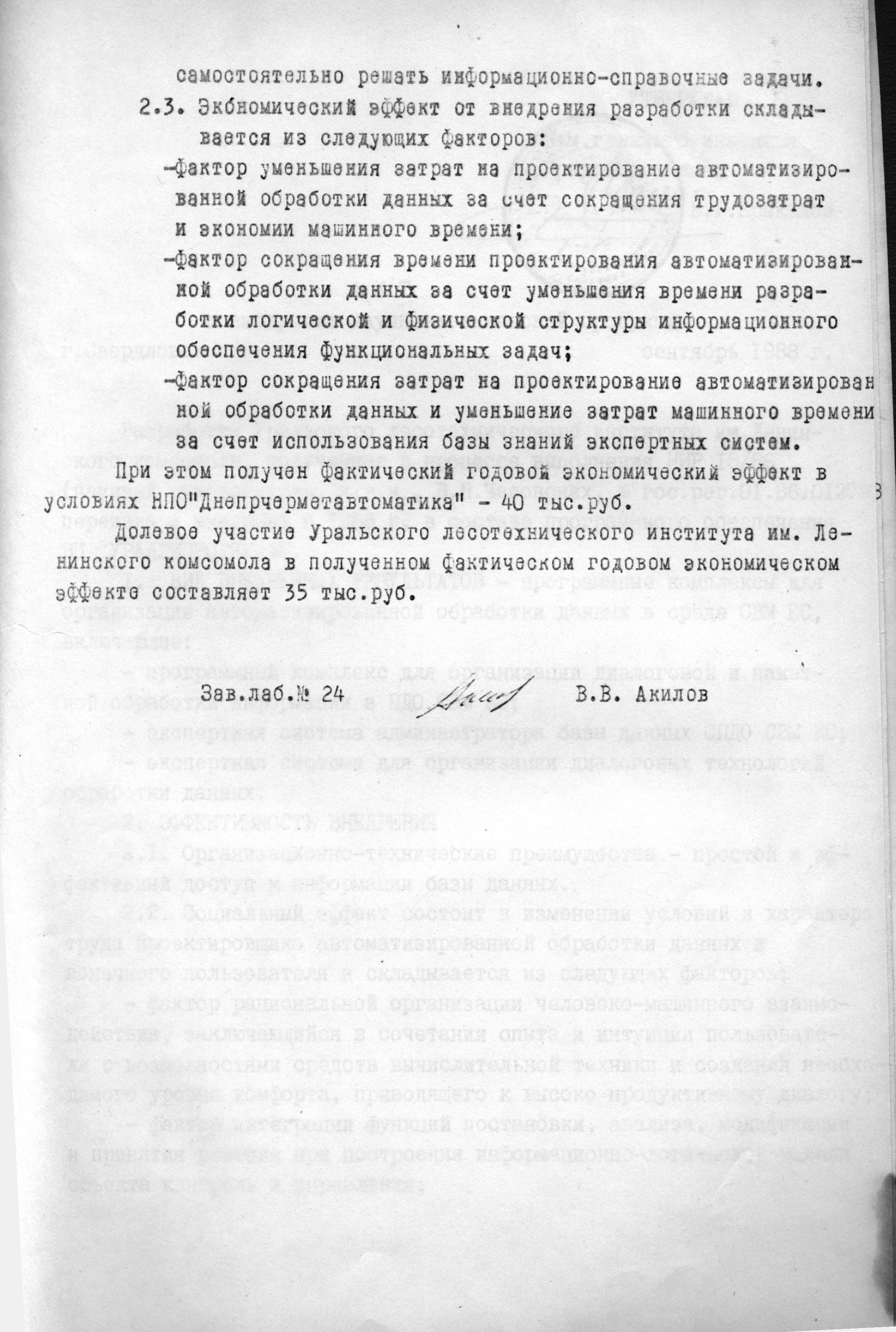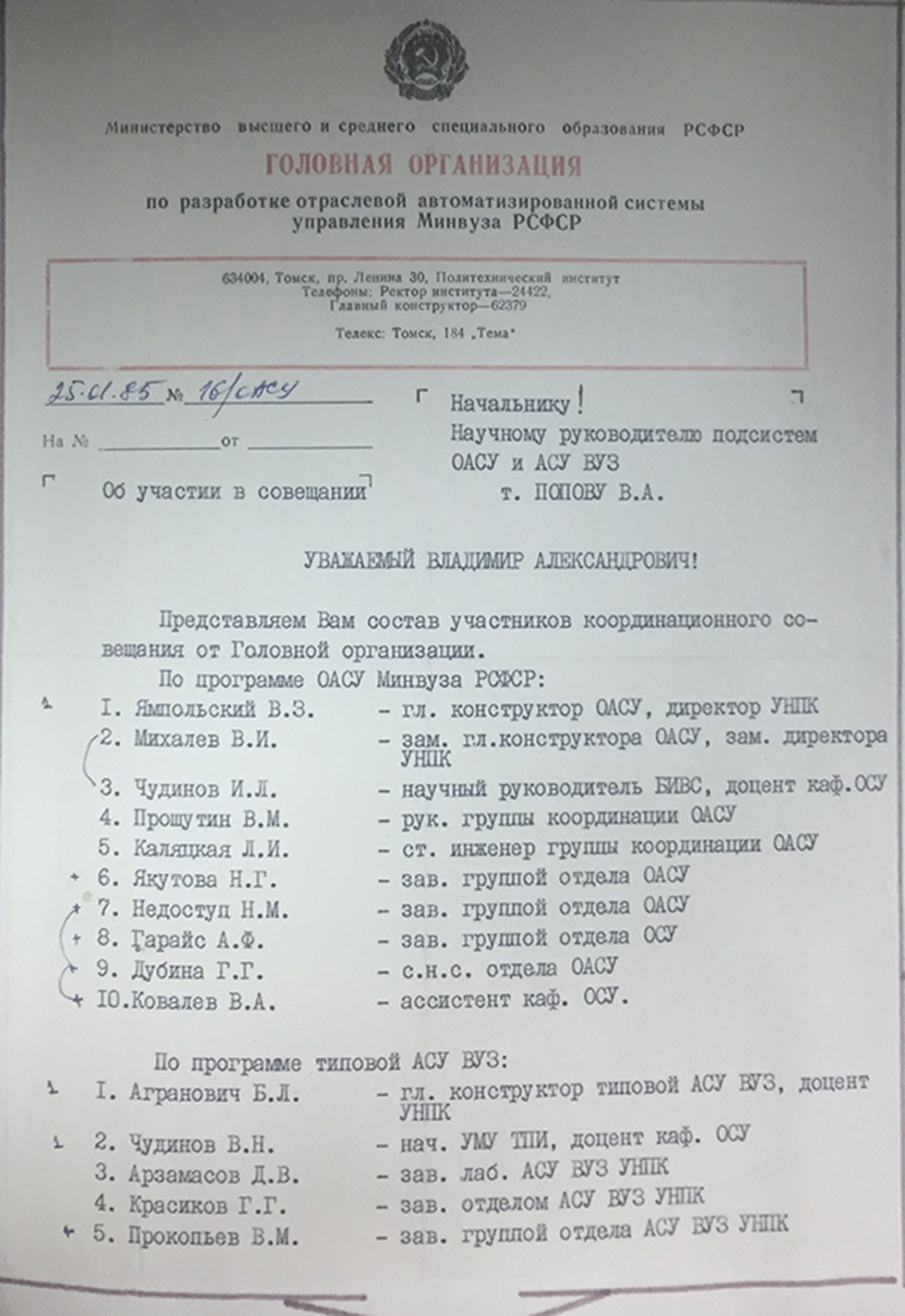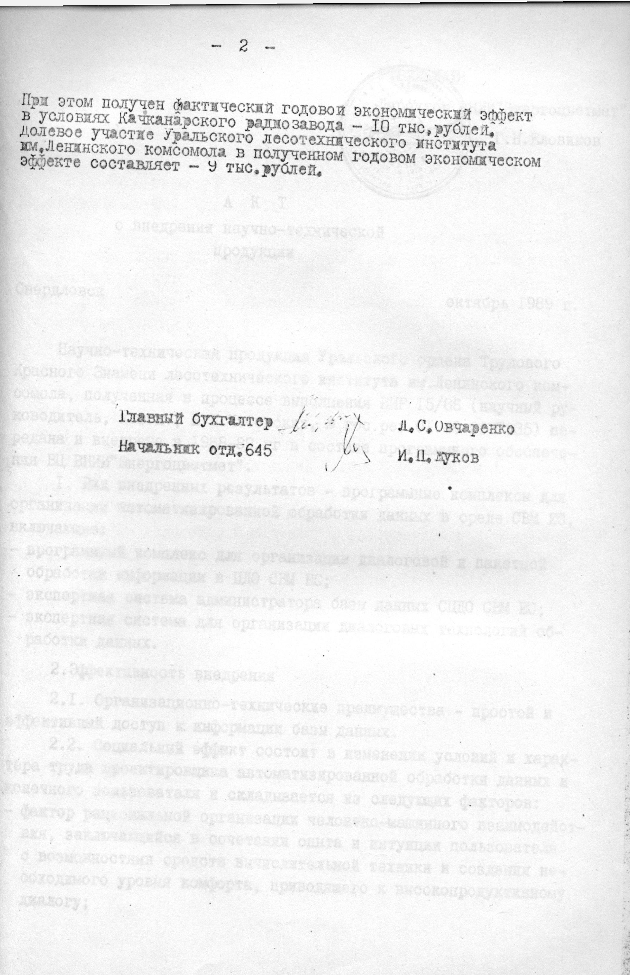 В середине 60-х годов 20-го века на радиотехническом факультете УПИ, в лаборатории №2, под руководством молодого ученого Попова Владимира Александровича (к.т.н., доцент) начали выполняться исследования по созданию и применению вычислительной техники в интересах обороны и народного хозяйства СССР. В 1967 году в эту лабораторию для участия в НИР был приглашен студент 2-го курса Часовских Виктор Петрович. Его руководителем был назначен Трыков Ю.В. При внедрении научных результатов Попова В.А. были созданы и приняты заказчиком уникальные вычислительные машины для летательных аппаратов. В 1969 году Попов В.А. пригласил в свою лабораторию двух студентов Тихоцкого Анатолия Игоревича и Хизунова Николай Михайловича. Их успехи в исследованиях были уникальными. Студенты закончили РТФ и остались работать в коллективе Попова В.А. Этот коллектив был хорошо известен в оборонной промышленности и ему были предложены работы по применению вычислительных машин для создания информационных систем различного назначения. Ректор УПИ Заостровский Ф.П. предложил возглавить работы по созданию АСУ УПИ. Часовских В.П. стал дополнительно системным программистом ВЦ УПИ и начал выполнять работы класса искусственного интеллекта, была создана и внедрена в эксплуатацию информационная система управления кадрами с моделями принятия решений в условиях неопределенности. Уникальные модели автоматизированного управления вузом, предложенные Поповым В.А., вызвали большой интерес Минвуза РСФСР, и он со своим коллективом был приглашен в программу создания ОАСУ Минвуза РСФСР и разработки типовой АСУ ВУЗ. Работы Часовских В.П. вызвали интерес Минрадиопрома, его группе была предложена НИР в интересах машиностроительных предприятий оборонной промышленности. К 1967 году научный коллектив Попова В.А. стал хорошо известен своими компетенциями в применении ЭВМ в широком спектре задач. В 1967 году началась программа всеобщей автоматизации высшего образования СССР (примерно тоже самое, что в 2020 г. цифровая трансформация лесного хозяйства). Ректор УЛТИ Казанцев Е.И. сделал предложение Попову В.А. перейти со своим коллективом в УЛТИ. Коллектив в это время плавал в бассейне «Юность», обсудили предложение и решили пойти работать в УЛТИ. Евгений Иванович вызывал доверие и уважение. Последняя НИР в УПИ была следующая.
