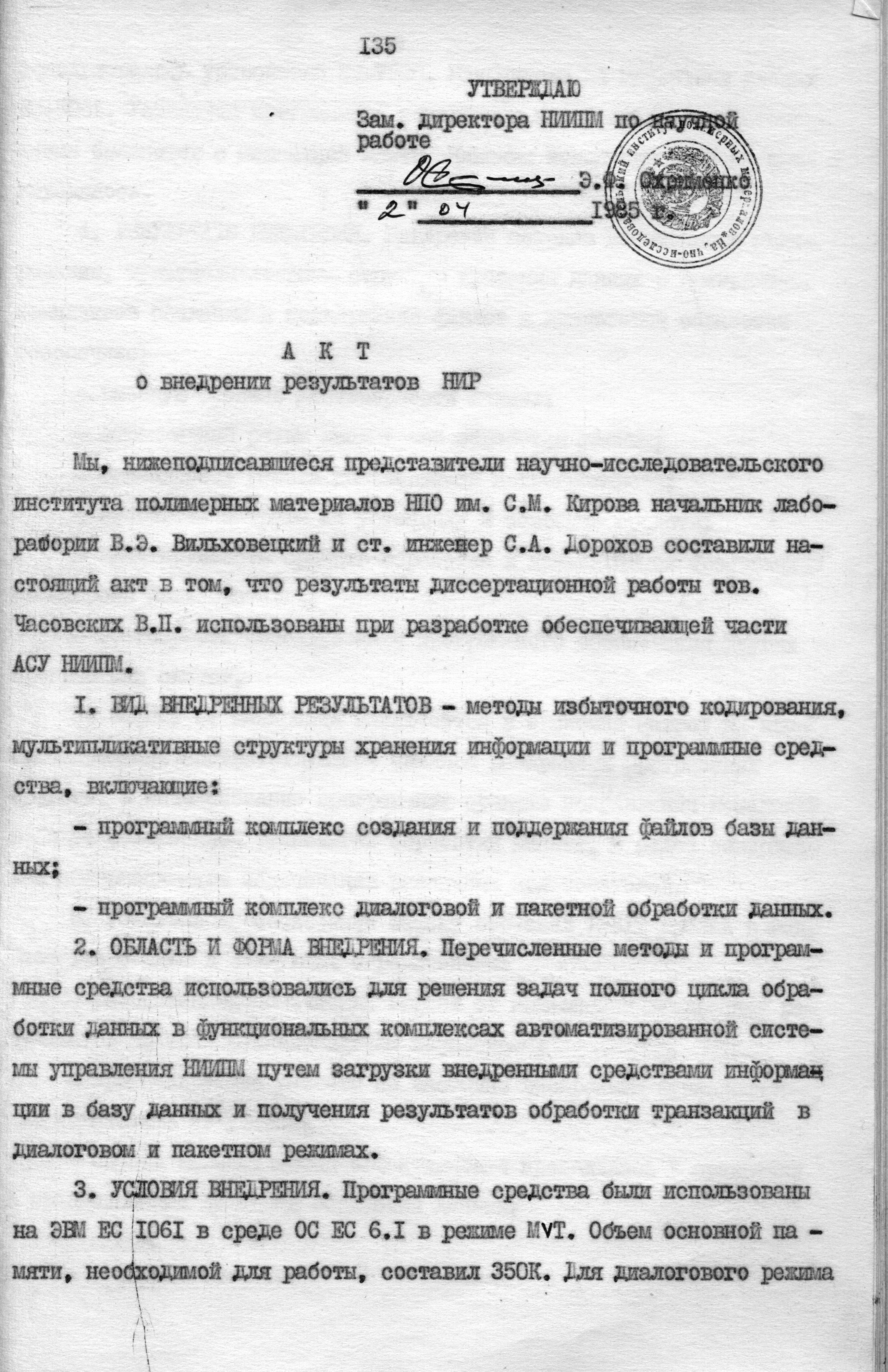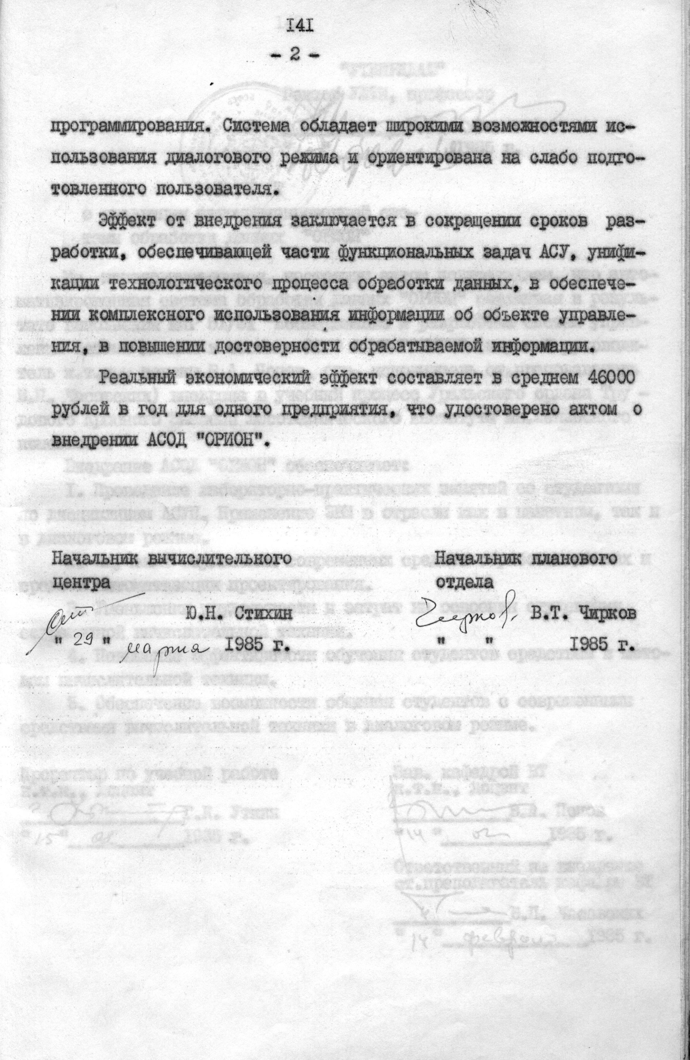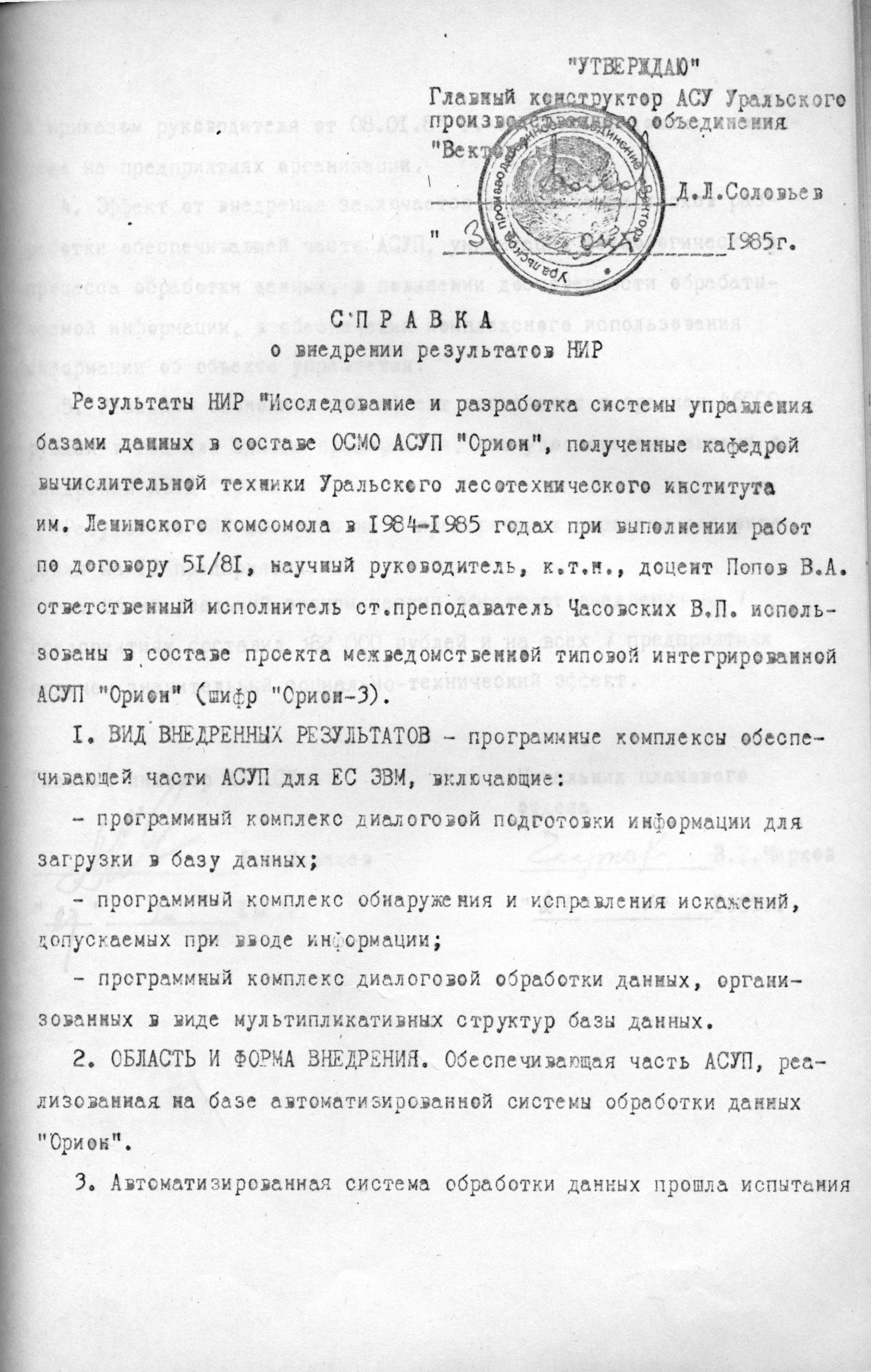 Более 15 лет кафедра ВТ УЛТИ выполняла важнейшие НИР и опытно-конструкторские работы по созданию автоматизированных систем управления предприятиями радиопромышленности, в частности исследование и разработка СУБД «ОРИОН», научный руководитель В.П. Часовских. По результатам исследований была защищена кандидатская диссертации ст. преподавателем В.П. Часовских. Тема кандидатской диссертации Часовских В.П. - «Кодирование, организация хранения и поиск информации на основе мультипликативных представлений в автоматизированных системах обработки данных» по специальности 05.13.06 - «Автоматизированные системы управления» В 1992 г. доц. В.П. Часовских защитил докторскую диссертацию. Тема докторской диссертации Часовских В.П. - «Теоретические основы, алгоритмы и практическая реализация экспертных систем в составе обеспечивающей части АСУП» по специальности 05.13.06 - «Автоматизированные системы управления». Исследования кафедры ВТ проводились в рамках: постановления Совета Министров СССР N 1370-377 от 13.11.86 г, и приказа Министра N 524 от 04. 12. 87 г. (тема НВУ-945-88 ); решения специальной комиссии Президиума Совета Министров СССР от 11.05.86 г. N 39. приказа министра от 07. 12.85 г. N 793 и технического задания на тему "Разработка и внедрение в составе ИАС САПР-ГАП-АСУП системы организационно-экономического управления предприятием", утвержденного Первым заместителем Министра 20. 08. 86 г., (были переданы УГЛТУ 2 ЭВМ типа ЕС-1035), а также при выполнении НИР и ОКР по созданию ИС и обеспечивающей части АСУ для различных промышленных предприятий ВПК. Научный руководитель Часовских В.П. Были выполнены следующие темы НИР УГЛТУ - НИР 15/86 N ГР 01860127935; НИР 9/88 N ГР 01880003468; НИР 31/86 N ГР 01880014809; НИР 97/89 N ГР 01890048029; НИР 49/89 N ГР 01890098030; НИР 17/81N ГР 81031382 (1312), отнесенных к важнейшим НИР. Научными руководителями являлись - Часовских В.П., Попов В.А., Тихоцкий А.И.