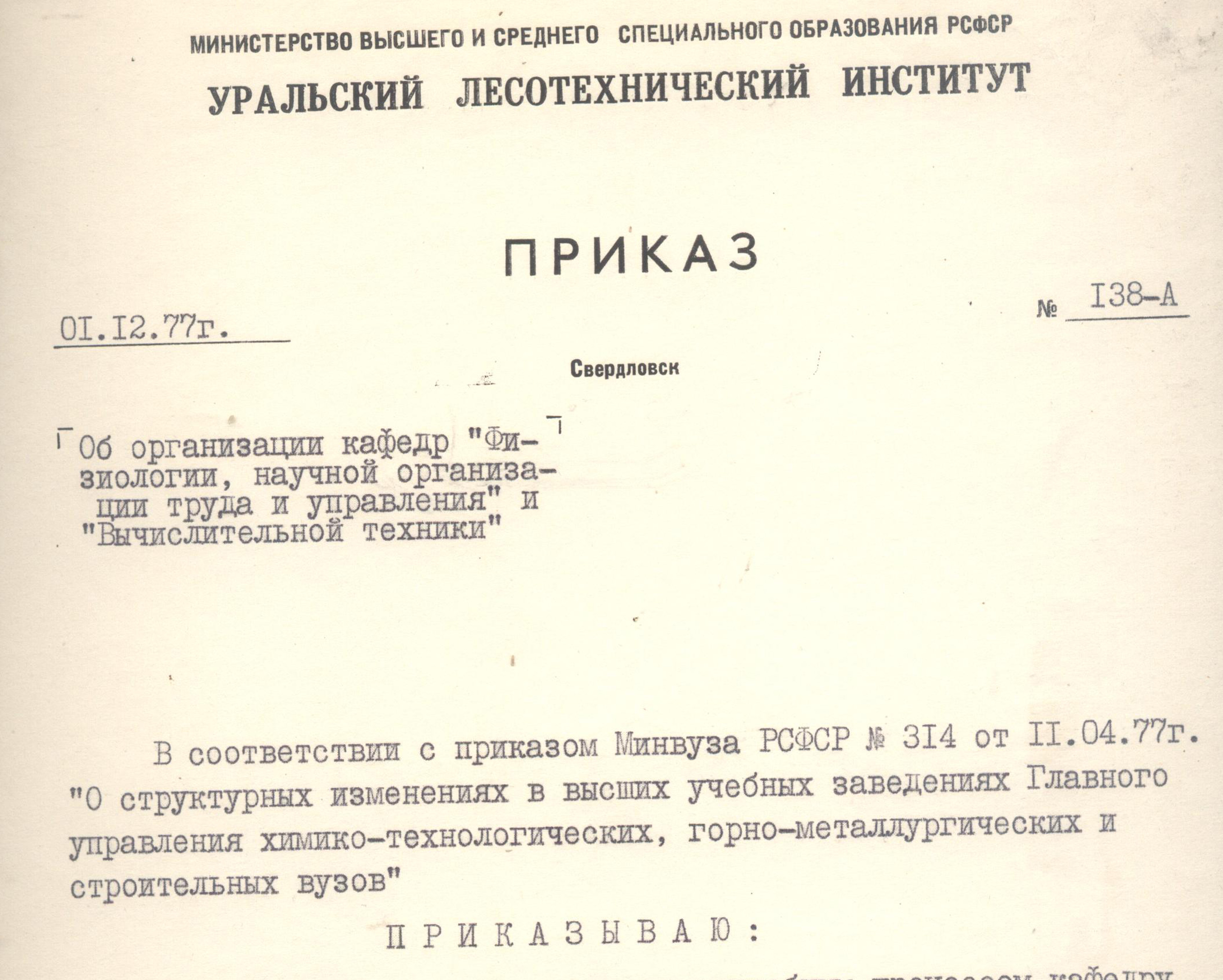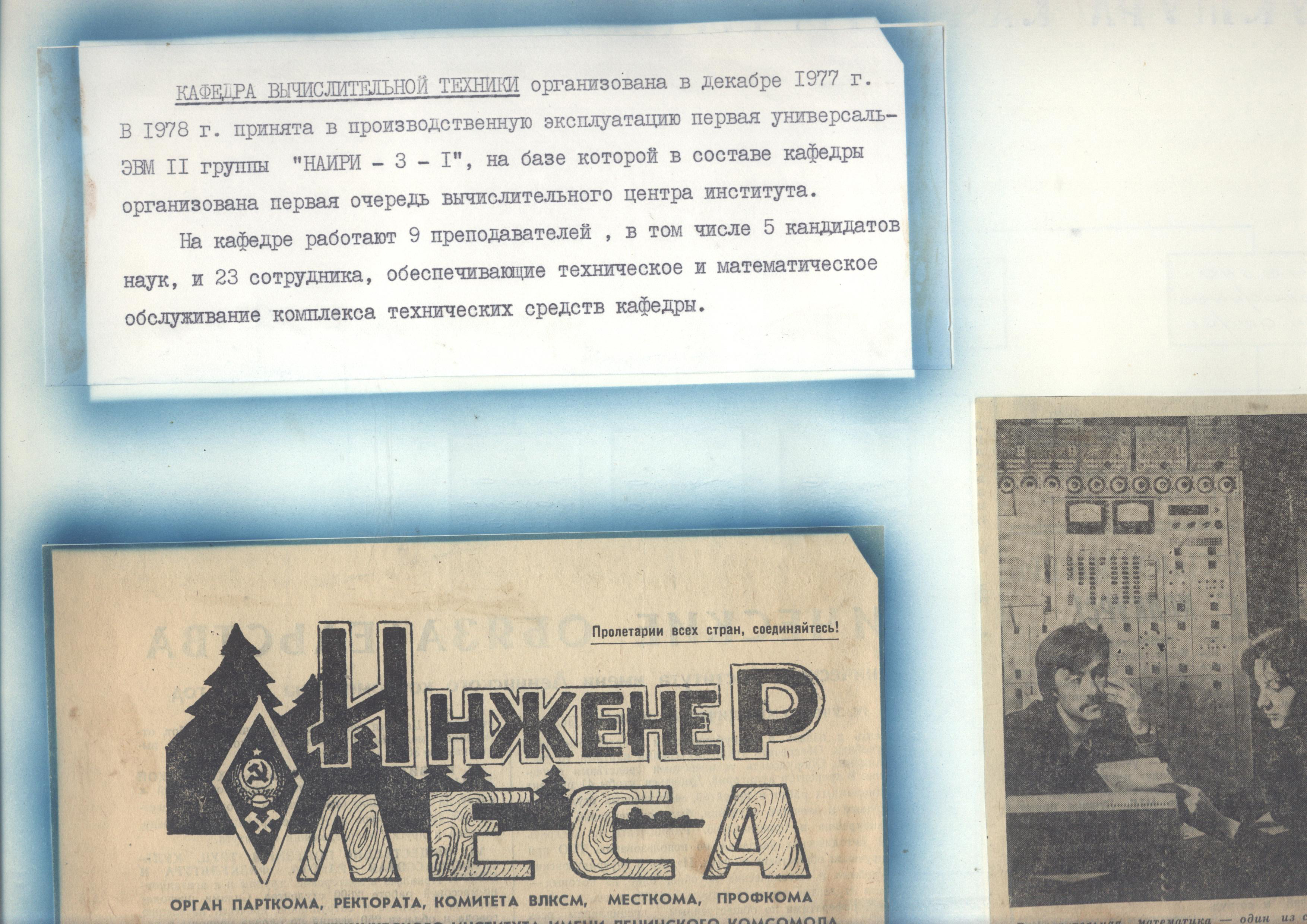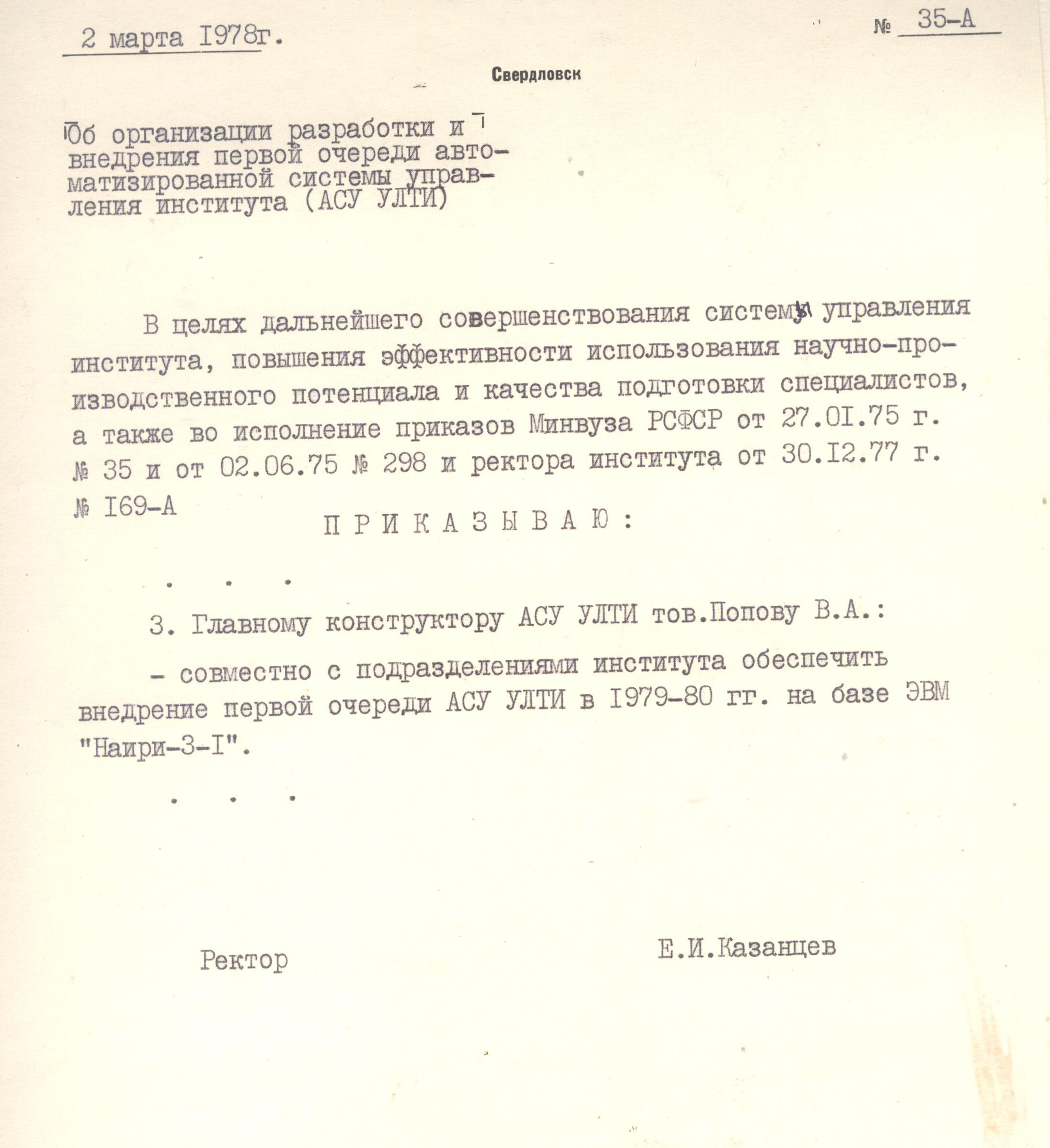 В ноябре 1977 г. ректор института Е.И. Казанцев назначил с 01.12.1977 г. на должность заведующего кафедрой «Вычислительная техника» (ВТ) к.т.н., доцента РТФ УПИ Попова В.А. Попов В.А. организовал перевод на кафедру ВТ УЛТИ с РТФ УПИ сотрудников своего коллектива Ю.В. Трыкова, В.П. Часовских, А.И. Тихоцкого. Чуть попозже на кафедру ВТ УЛТИ перешли Н.М. Хизунов, Н.М. Анкудинова, А.И. Бутя, Л.И. Бутя, Г.А. Евсюкова, С.А. Журова, B.Н. Зорихина, А.И. Монтиле. В 1978 г. УЛТИ получил ЭВМ «НАИРИ-3-1», работающую в режиме ЭВМ Минск – 22. Попов В.А. организовал выделение Минвузом РСФР штата для её обслуживания. Приказом ректора УЛТИ был создан вычислительный центр (ВЦ) УЛТИ. Начальником ВЦ был назначен Хизунов Н.М. Следующим начальником ВЦ УЛТИ был Алов Н.М. В 1978 году из УПИ был переведен специалист высшей квалификации по обслуживанию и ремонту ЭВМ Руденко Владимир Николаевич. Попов В.А. организовал профессиональное обучение Руденко В.Н. в НИИ ЭВМ г. Еревана и НИИ ЭВМ г. Минск. В подчинение Руденко В.Н. был принят специалист высшей квалификации по радиоэлектронике Брызгалов А.В. После окончания РТФ УПИ по специальности «Автоматика и телемеханика» в штат кафедры ВТ УЛТИ была принта Карасева О.А. После окончания УРГУ в 1981 году на кафедру была принята Акчурина Г.А. На кафедру ВТ УЛТИ была возложена задача по разработке и реализации комплексной программы, направленной на обеспечение подготовки специалистов, повышение квалификации научно-педагогических кадров, научно-производственного потенциала института на основе широкого применения средств вычислительной техники и современных экономико-математических методов управления. По решению ректората и в соответствии с координационным планом НИР по проблемам высшей школы Минвуза СССР кафедра выполняла госбюджетную научно-исследовательскую работу «Автоматизированная система обучения и управления УЛТИ как элемент АСУ ВШ», реализуя вузовскую программу повышения квалификации научно-педагогических сотрудников института в области использования вычислительных средств. В 1978-1980 гг. прошли подготовку 8 потоков преподавателей и научных сотрудников (из 119 человек сдали зачет по курсу только 76 человек). Наиболее активными слушателями были разработаны на основе полученных знаний технические задания на программирование и программы решения задач, которые составили специализированный фонд студенческого программного обеспечения. По инициативе М.И. Ведерниковой (кафедра XТД) создано 5 программ по процессам и аппаратам химической технологии. Доценты И.Т. Глебов (кафедра станков и инструментов) и М.Я. Коломак (кафедра тяговых машин) разработали программы для выполнения курсовых и дипломных работ. Опытная эксплуатация двух первых комплексов АСОУ УЛТИ была успешно проведена в декабре 1979 г., а в конце 1980 г. завершена разработка, проведено внедрение и ведомственная приемка первой очереди системы. Кафедра обеспечивала проведение всех видов учебных занятий по дисциплинам «Вычислительная техника в инженерных и экономических расчетах» и «Автоматизированные системы управления» со студентами ЛИФ, ЛМФ, ЛХФ. ХТФ и МТД, а также по дисциплинам «Введение в программирование», «Теория вероятностей и математическая статистика», «Вычислительные машины и программирование» и «Автоматизированные системы управления предприятиями» со студентами И