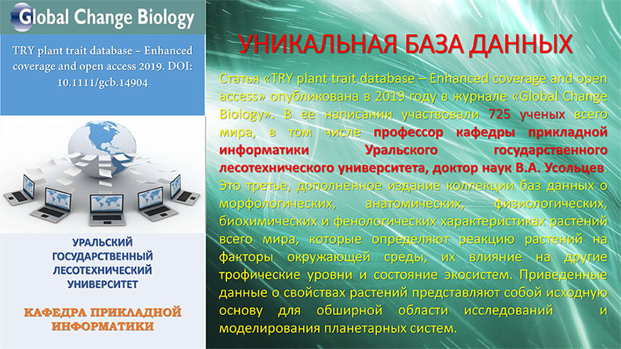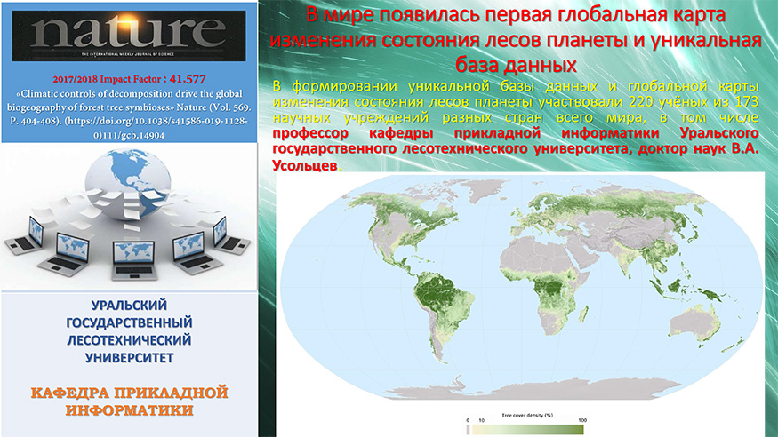 Одним из лидеров нашего университета и кафедры ПИ (до её ликвидации) по количеству монографий является Заслуженный лесовод Российской Федерации, профессор, доктор наук Усольцев Владимир Андреевич, руководитель научно-педагогической школы кафедры ПИ УГЛТУ «Оценка и моделирование фитомассы лесов». Полученные в результате длительных исследований базы данных лесов и разработанное программное обеспечение являются важным интеллектуальным продуктом и имеют государственную регистрацию. В 2019 году большой группой ученых Мира была впервые сформирована база данных из более 28000 видов древесных растений и разработана глобальная карта симбиотического статуса лесов. В создании этого уникального, интеллектуального продукта использовались и материалы исследований В.А. Усольцева, что представлено в уникальной публикации статьи «Climatic controls of decomposition drive the global biogeography of forest tree symbioses» в журнале Nature (Vol. 569. P. 404-408). (https://doi.org/10.1038/s41586-019-1128-0). Журнал «Nature» один из самых старых и авторитетных общенаучных журналов, издается с 1869 г., 2017/2018 Impact Factor: 41.577. Отдельно следует отметить, что данное научное достижение, является единственным от РФ, включенным в Мировую базу данных. Кафедра ИТ гордиться этим научным результатом, а наш университет как-то скромно умалчивает. Виктор Петрович достижения Усольцева В.А., как профессора кафедры ПИ УГЛТУ навсегда разместил в среде Интернет. Базы данных В. А. Усольцева получили широкое применение не только в России, но и за рубежом. В частности, они использованы японскими исследователями Т. Каджимото и А. Осава в книге «Экосистемы на многолетней мерзлоте: леса сибирской лиственницы» (2010). Это также научный результат кафедры ПИ. В течение 2006-2008 гг. в результате весьма плодотворного сотрудничества с научной школой профессора В. П. Часовских в УГЛТУ была разработана информационная система пространственного анализа депонирования углерода лесным покровом на площади более 100 млн. га в 10 территориальных образованиях Уральского региона на платформе СУБД «АДАБАС» с приложениями Natural, позволяющая оценивать уровень потенциального поглощения выбросов диоксида углерода лесными экосистемами и все расчеты и картирование результатов актуализировать в автоматическом режиме без участия оператора. В настоящее время на основе созданных баз данных и современных методик В.А. Усольцевым выполняются исследования по изменению углерод депонирующей способности лесов Евразии в результате климатических сдвигов, результаты которых опубликованы в 30 зарубежных журналах, индексируемых в базах Scopus и Web of Science.