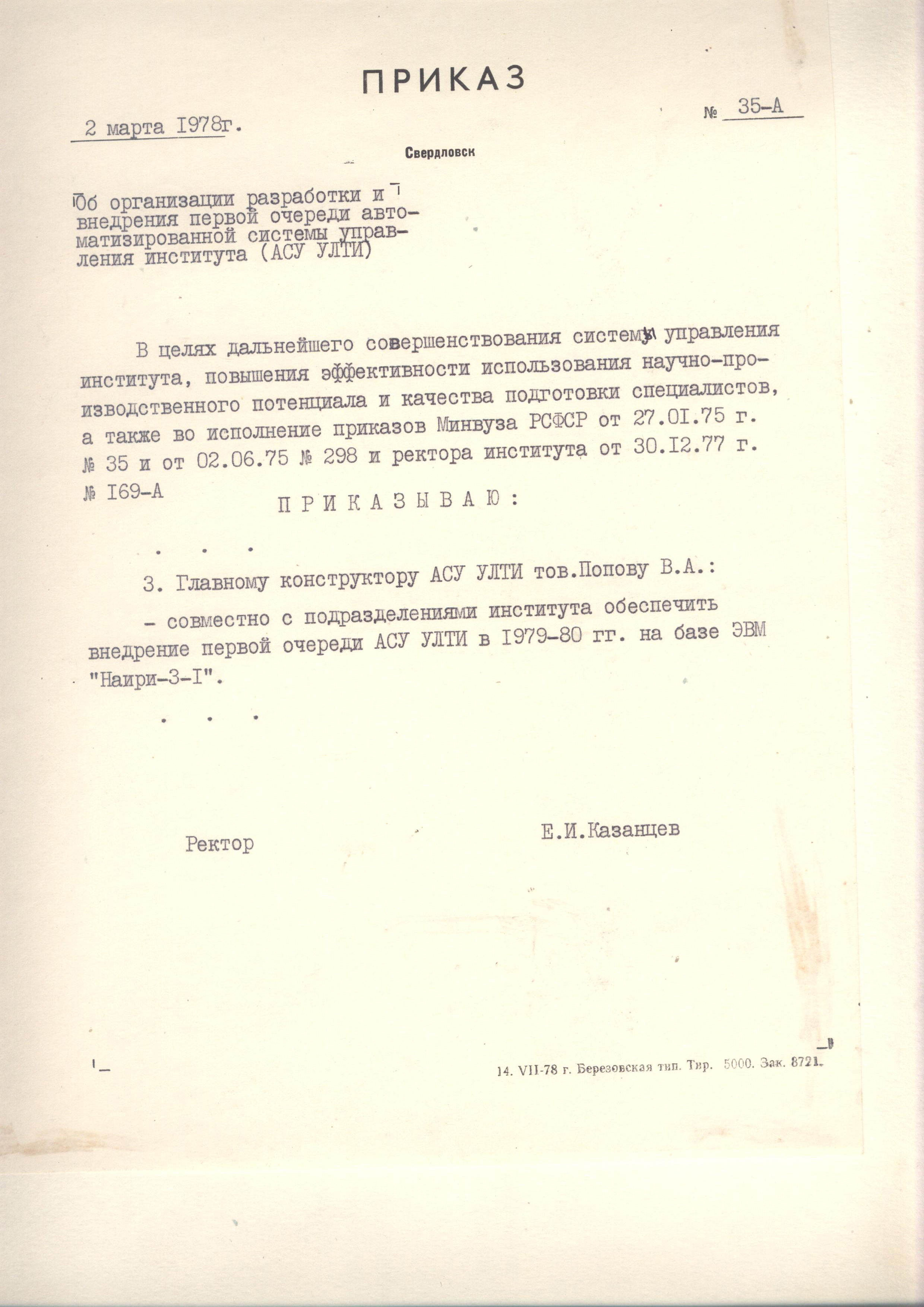В 1978 г. в составе кафедры вычислительной тех создан вычислительный центр института. Приказом ректора от 02.03.1978 г. № 35а определено начало внедрения первой очереди автоматизированной системы управления, главным конструктором АСУ института был назначен зав. кафедрой вычислительной техники, к. т. н., доцент Владимир Александрович Попов.