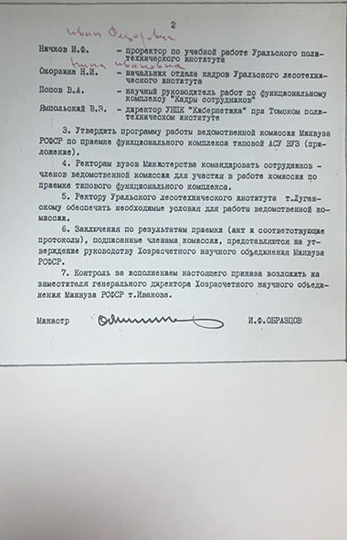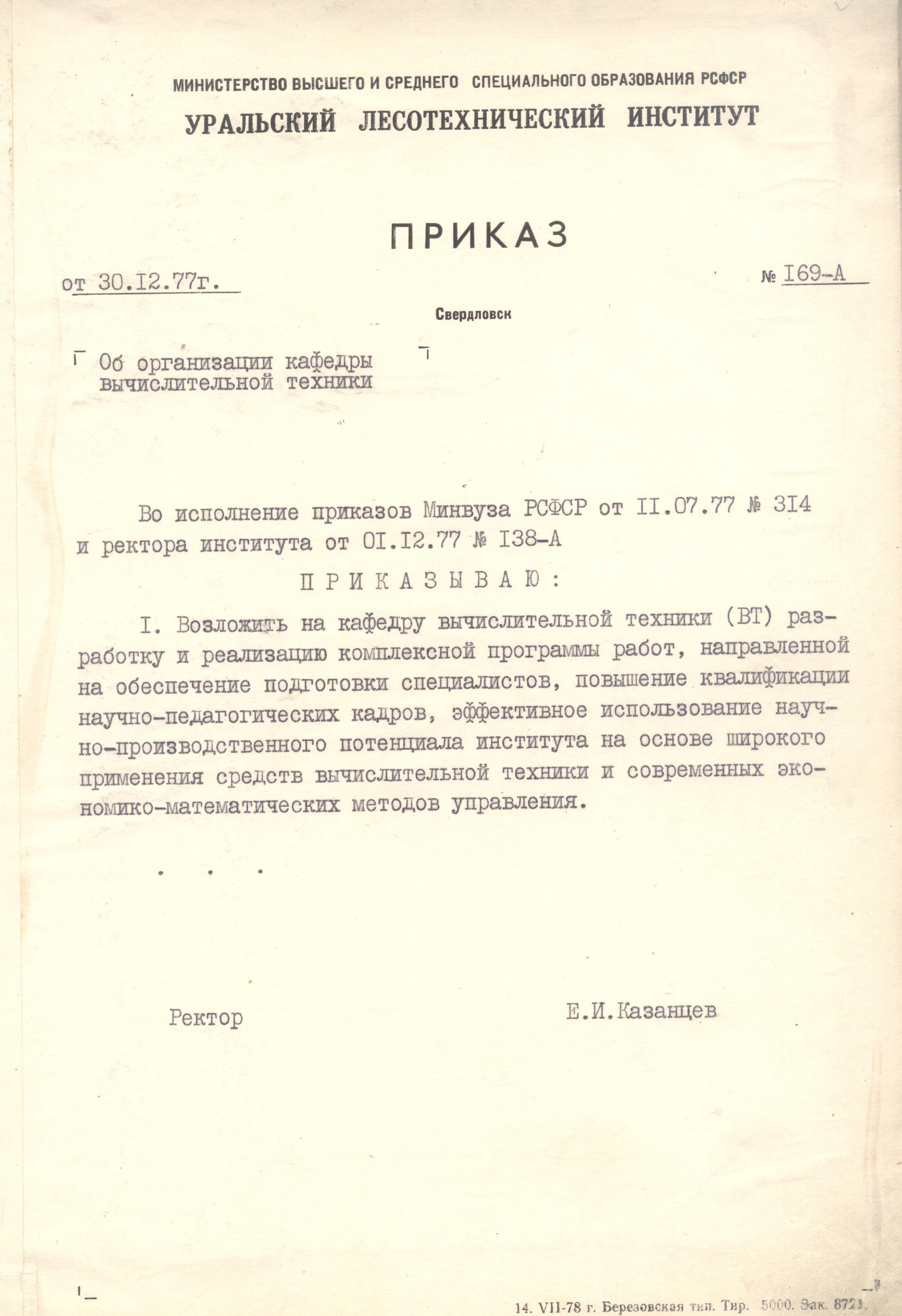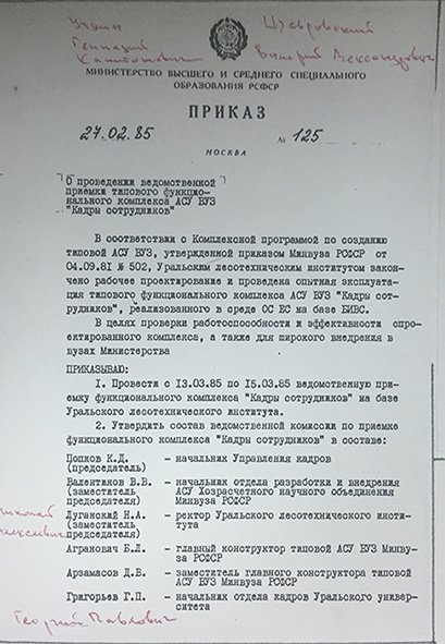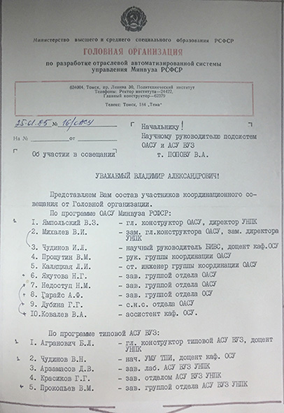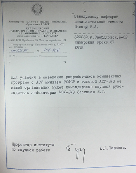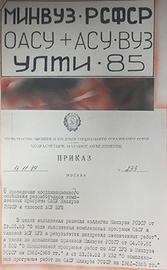 В соответствии с планами Координационного центра НИР по проблемам высшей школы Минвуза СССР кафедра вычислительной техники начинает выполнять важнейшую госбюджетную научно- исследовательскую работу «Автоматизированная система обучения и управления УЛТИ как элемент АСУ ВШ». Апробирование двух первых комплексов АСОУ УЛТИ проведено в декабре 1979 г., а в конце 1980 г. завершены разработка, внедрение и ведомственная приемка первой очереди системы. Научным руководителем важнейших НИР для министерства являлся Попов В.А., ответственным исполнителем Часовских В.П.