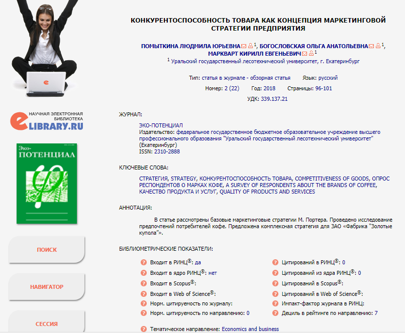 Статья в журнале РИНЦ | КОНКУРЕНТОСПОСОБНОСТЬ ТОВАРА КАК КОНЦЕПЦИЯ МАРКЕТИНГОВОЙ СТРАТЕГИИ ПРЕДПРИЯТИЯ | Л.Ю.Помыткина, О.А.Богословская, К.Е.Маркварт | ЭКО-потенциал. 2018 №2(22), с.96-101 | ISSN 2310-2888 | Контракт | 2018 | Посмотреть | |