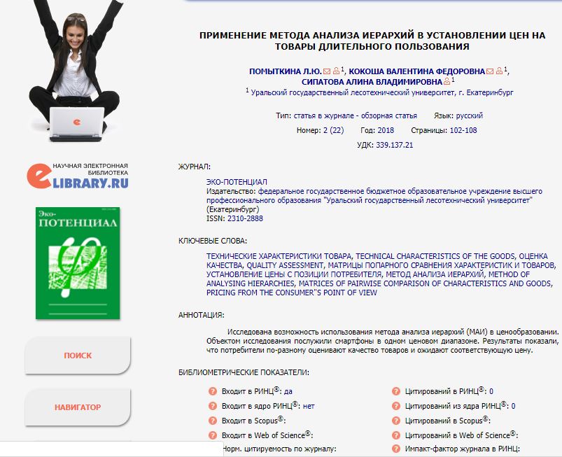 Статья в журнале РИНЦ | ПРИМЕНЕНИЕ МЕТОДА АНАЛИЗА ИЕРАРХИЙ В УСТАНОВЛЕНИИ ЦЕН НА ТОВАРЫ ДЛИТЕЛЬНОГО ПОЛЬЗОВАНИЯ | Л.Ю.Помыткина, В.Ф.Кокоша, А. Сипатова | ЭКО-потенциал. 2018 №2(22), с.102-108 | ISSN 2310-2888 | Контракт | 2018 | Посмотреть | |
