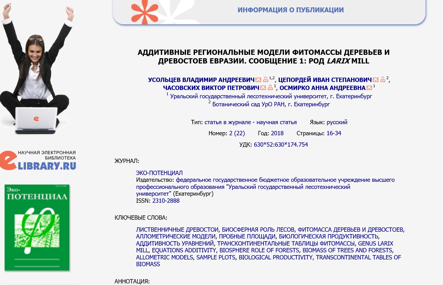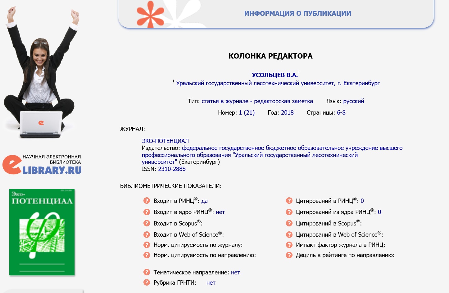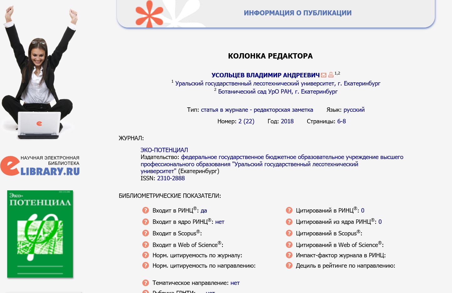 Статья в журнале РИНЦ | КОЛОНКА РЕДАКТОРА | Усольцев В.А. | Эко-потенциал. 2018. № 2 (22). С. 6-8. | ISSN 2310-2888 | Контракт | 2018 | Посмотреть | |