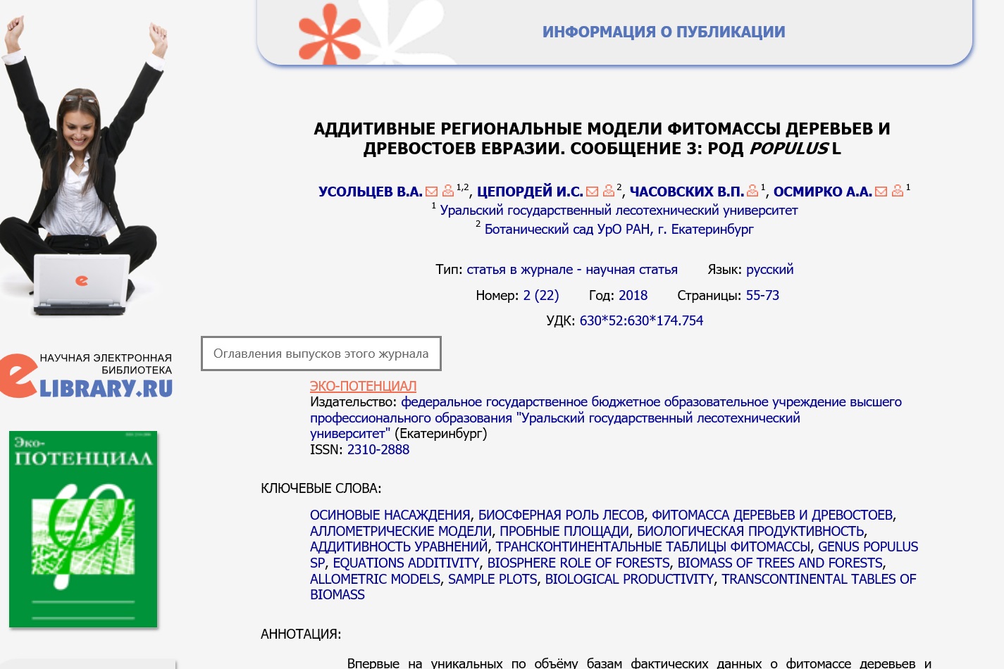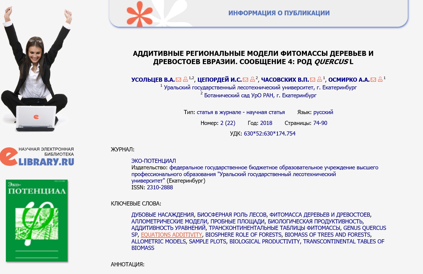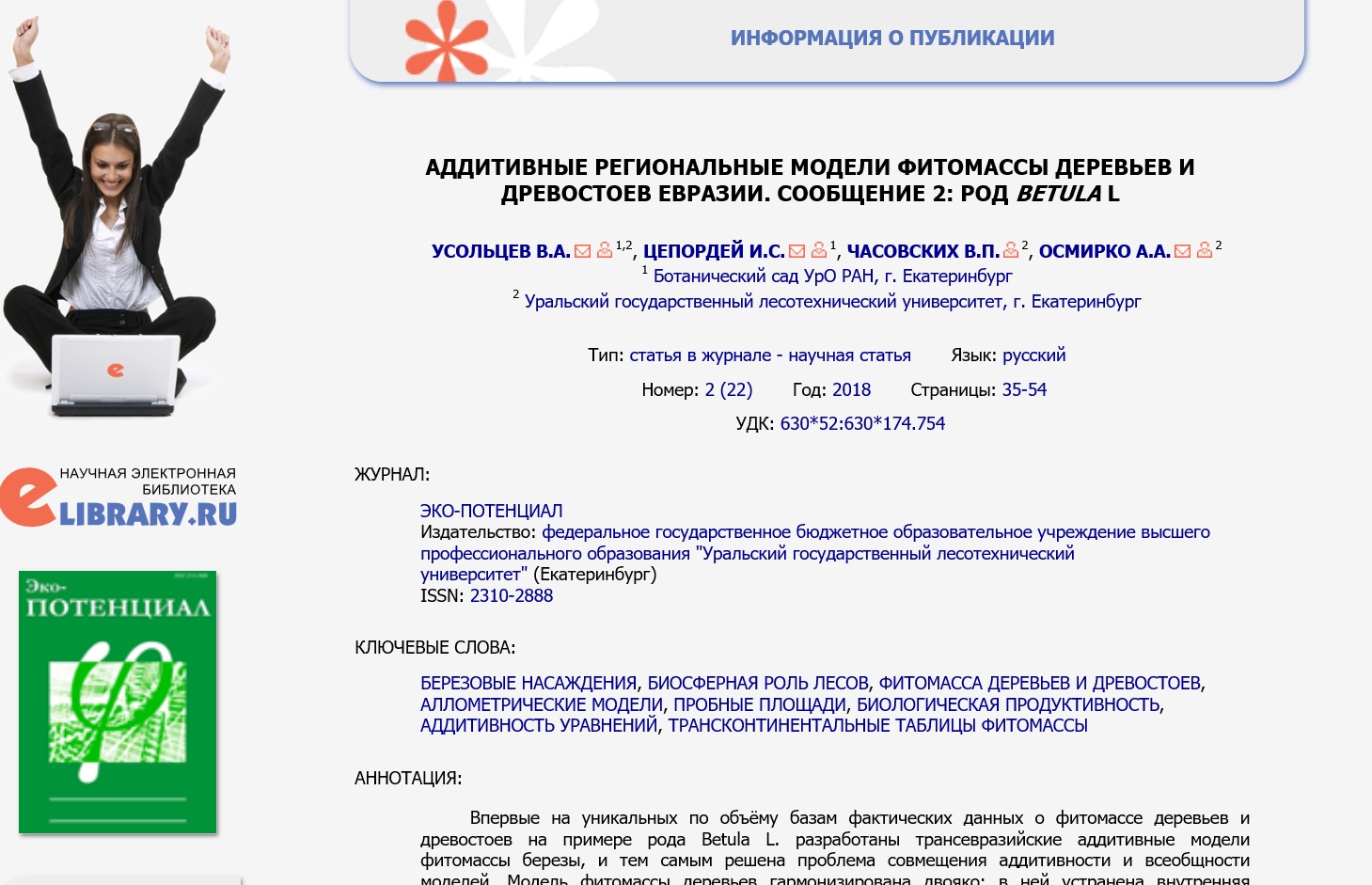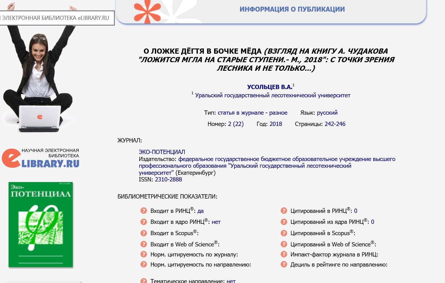 Статья в журнале РИНЦ | КОЛОНКА РЕДАКТОРА | Усольцев В.А. | Эко-потенциал. 2018. № 2 (22). С. 6-8. | ISSN 2310-2888 | Контракт | 2018 | Посмотреть | |