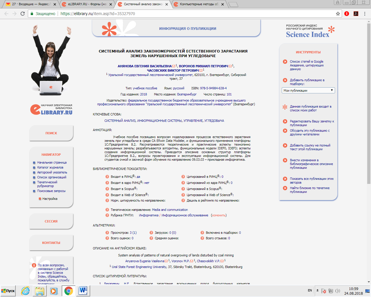 Статья в журнале РИНЦ | Системный анализ закономерностей естественного зарастания земель нарушенных при угледобыче. | Анянова Е.В., Воронов М.П., Часовских В.П. | Екатеринбург: Урал. гос. лесотехн. ун-т, 2018. 101 с. | ISBN 978-5-94984-638-4 | Контракт | 2018 | Посмотреть | |