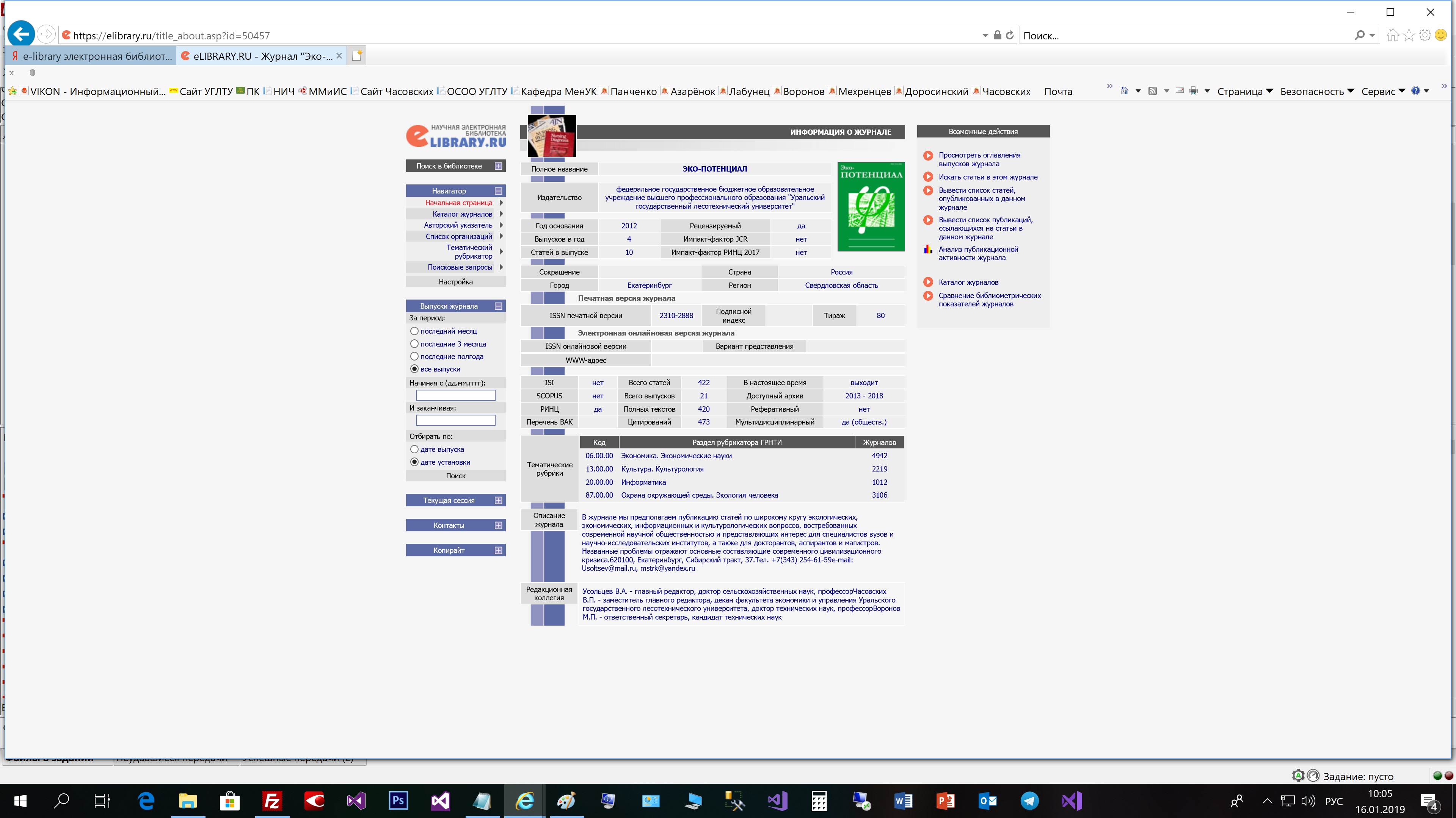 Статья в журнале РИНЦ | КОЛОНКА РЕДАКТОРА | Усольцев В.А. | Эко-потенциал. 2018. № 1 (21). С. 6-8. | ISSN 2310-2888 | Контракт | 2018 | Посмотреть | |