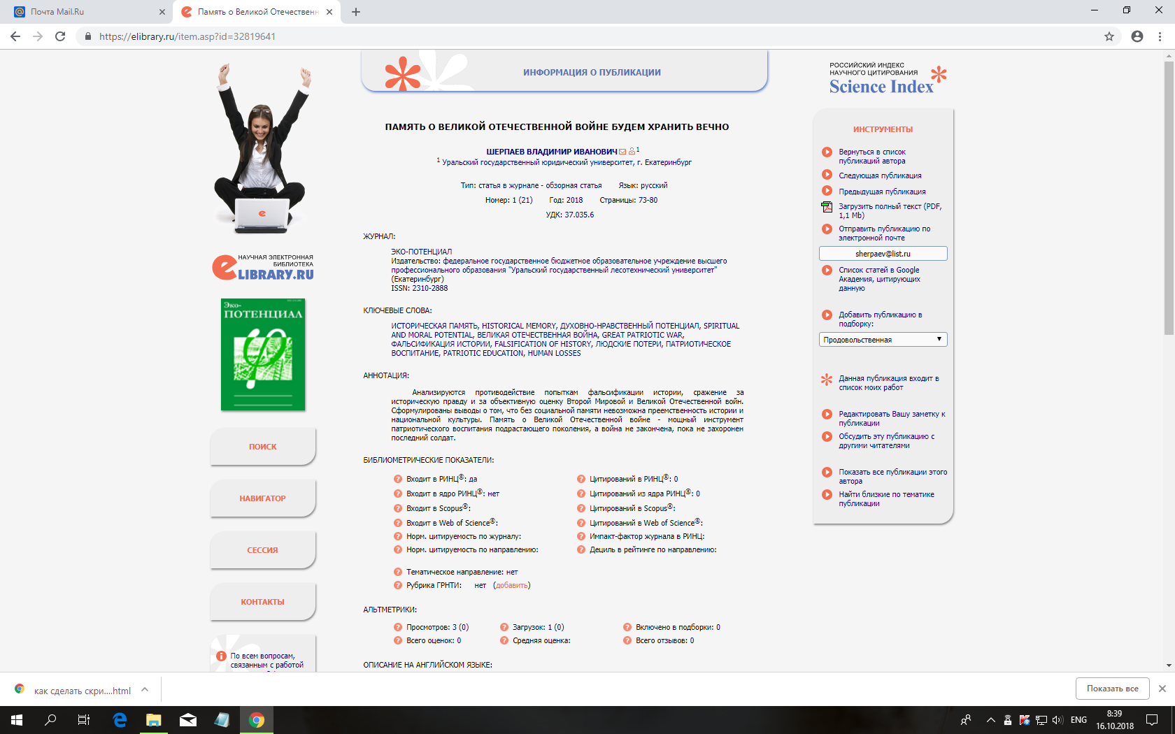 Статья в журнале РИНЦ | Память о Великой Отечественной войне будем хранить вечно | Шерпаев В.И. | УГЛТУ, Эко-потенциал, № 4 (21), 2018, 73-80 | ISSN 2310-2888 | Контракт | 2018 | Посмотреть | |