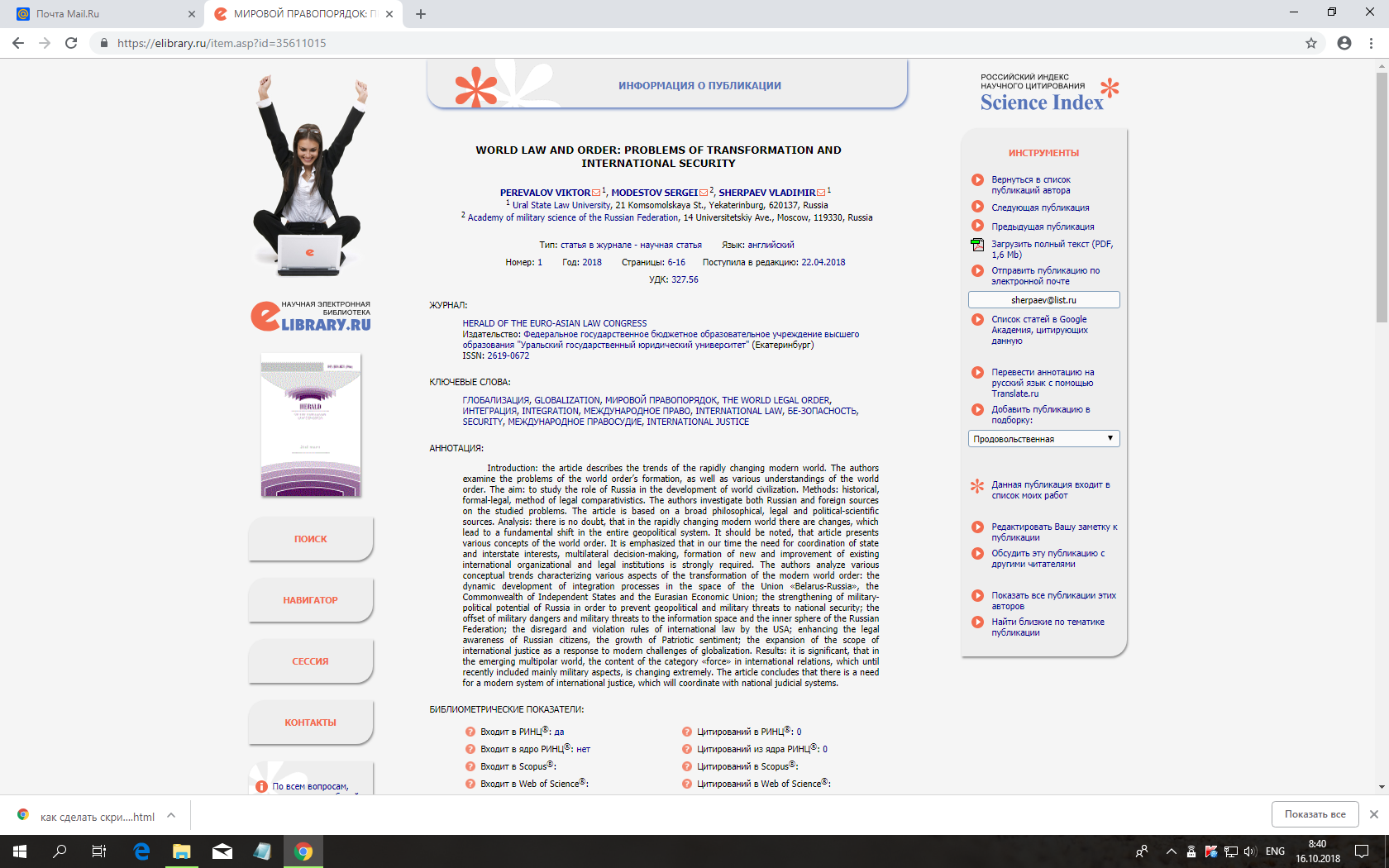 Статья в журнале РИНЦ | WORLD LAW AND ORDER: PROBLEMS OF TRANSFORMATION AND INTERNATIONAL SECURITY | VIKTOR D. PEREVALOV, SERGEI A. MODESTOV, VLADIMIR I. SHERPAEV | Herald of The Euro-Asian Law Congress. 2018. Is. 1. Pp. 6–16. | ISSN 2619-0672 | Контракт | 2018 | Посмотреть |