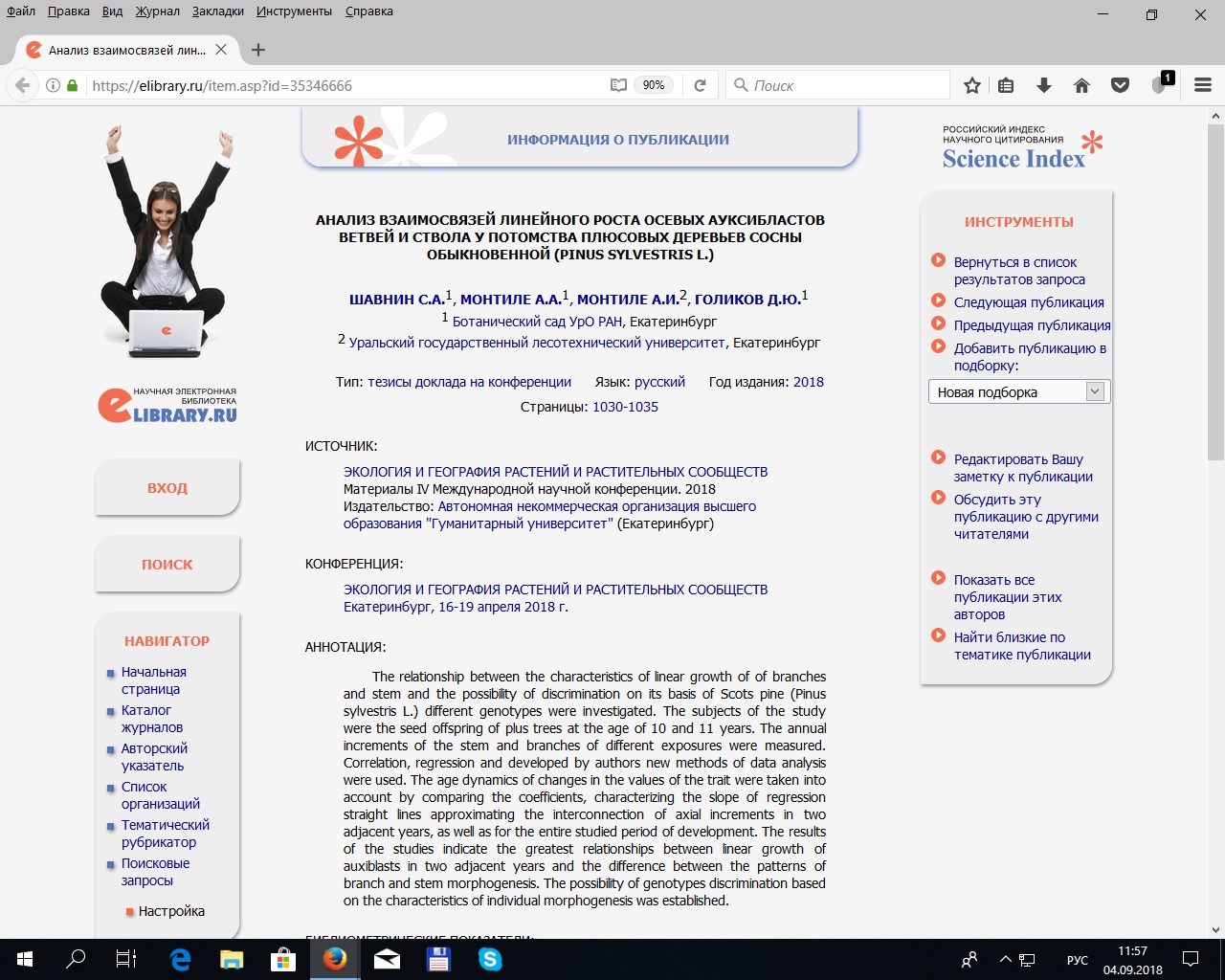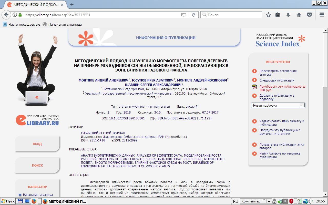 Статья в журнале РИНЦ | Forest Arabesques, OrSketchesof Our Trees’Life | Vladimir Usoltsev | Radomska Szkoła Wyższaw Radomiu.Radom.200p.2019 | ISBN 978-0-359-39022-9 | Бюджет | DOI http://dx. doi. org/10. 5281/zenodo. 2551187 | 2019 | Посмотреть |