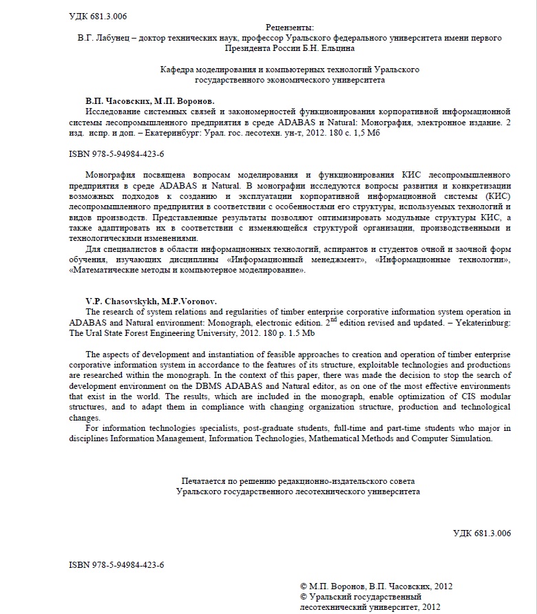 Статья в журнале РИНЦ | Исследование системных связей и закономерностей функционирования корпоративной информационной системы лесопромышленного предприятия в среде ADABAS и Natural | В.П. Часовских, М.П. Воронов | 2 изд. испр. и доп. – Екатеринбург: Урал. гос. лесотехн. ун-т, 2015. 180 с. 1,5 Мб | ISBN 978-5-94984-423-7 | Контракт | 2018 | Посмотреть |