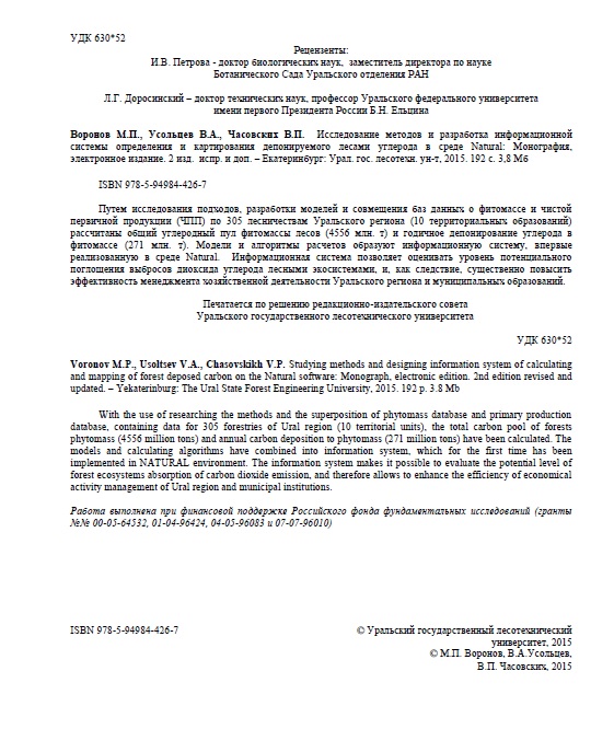 Статья в журнале РИНЦ | Исследование методов и разработка информационной системы определения и картирования депонируемого лесами углерода в среде Natural | В.П. ЧАСОВСКИХ, М.П. ВОРОНОВ, В.А. УСОЛЬЦЕВ | 2 изд. испр. и доп. – Екатеринбург: Урал. гос. лесотехн. ун-т, 2015. 192 с. 3,8 Мб | ISBN 978-5-94984-423-6 | Контракт | 2018 | Посмотреть | |